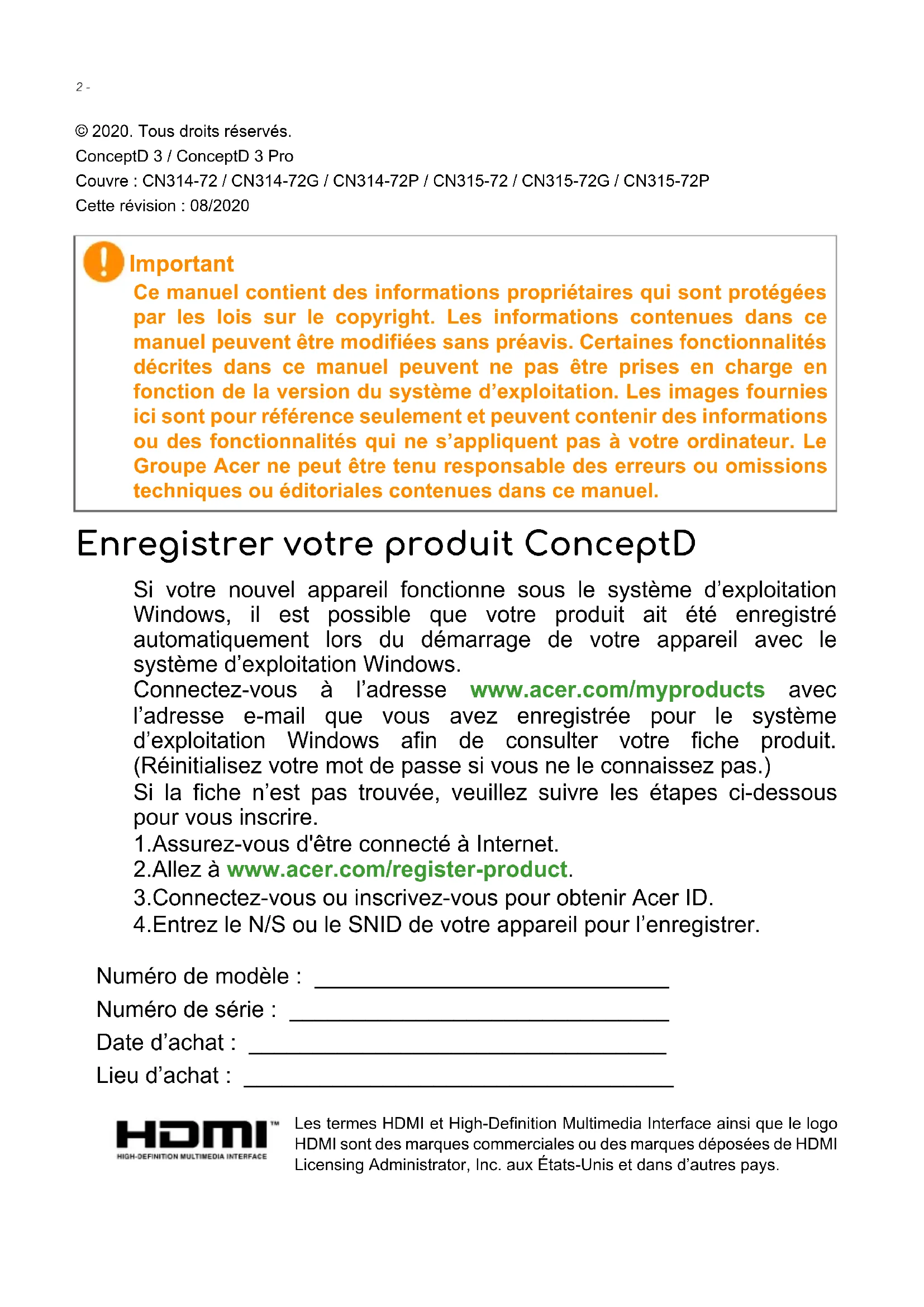 © 2020. Tous droits réservés. ConceptD 3 / ConceptD 3 Pro Couvre : CN314-72 / CN314-72G / CN314-72P / CN315-72 / CN315-72G / CN315-72P Cette révision : 08/2020 Enregistrer votre produit ConceptD Si votre nouvel appareil fonctionne sous le système d’exploitation Windows, il est possible que votre produit ait été enregistré automatiquement lors du démarrage de votre appareil avec le système d’exploitation Windows. Connectez-vous à l’adresse www.acer.com/myproducts avec l’adresse e-mail que vous avez enregistrée pour le système d’exploitation Windows afin de consulter votre fiche produit. (Réinitialisez votre mot de passe si vous ne le connaissez pas.) Si la fiche n’est pas trouvée, veuillez suivre les étapes ci-dessous pour vous inscrire. 1.Assurez-vous d'être connecté à Internet. 2.Allez à www.acer.com/register-product. 3.Connectez-vous ou inscrivez-vous pour obtenir Acer ID. 4.Entrez le N/S ou le SNID de votre appareil pour l’enregistrer. Important Ce manuel contient des informations propriétaires qui sont protégées par les lois sur le copyright. Les informations contenues dans ce manuel peuvent être modifiées sans préavis. Certaines fonctionnalités décrites dans ce manuel peuvent ne pas être prises en charge en fonction de la version du système d’exploitation. Les images fournies ici sont pour référence seulement et peuvent contenir des informations ou des fonctionnalités qui ne s’appliquent pas à votre ordinateur. Le Groupe Acer ne peut être tenu responsable des erreurs ou omissions techniques ou éditoriales contenues dans ce manuel. Numéro de modèle : ____________________________ Numéro de série : ______________________________ Date d’achat : _________________________________ Lieu d’achat : __________________________________ Les termes HDMI et High-Definition Multimedia Interface ainsi que le logo HDMI sont des marques commerciales ou des marques déposées de HDMI Licensing Administrator, Inc. aux États-Unis et dans d’autres pays.Table des matières - 3