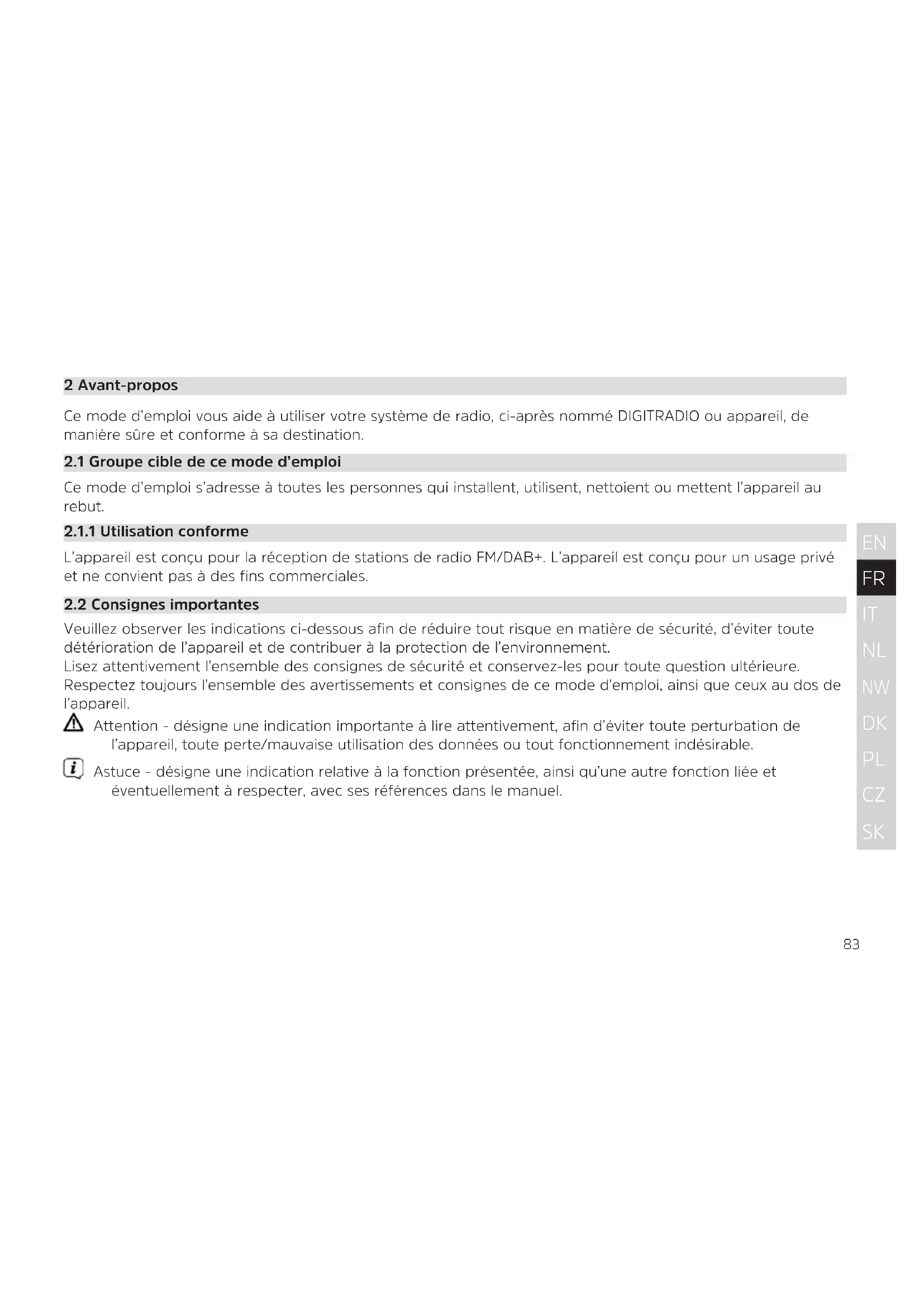 2 Avant-propos Ce mode d’emploi vous aide à utiliser votre système de radio, ci-après nommé DIGITRADIO ou appareil, de manière sûre et conforme à sa destination.