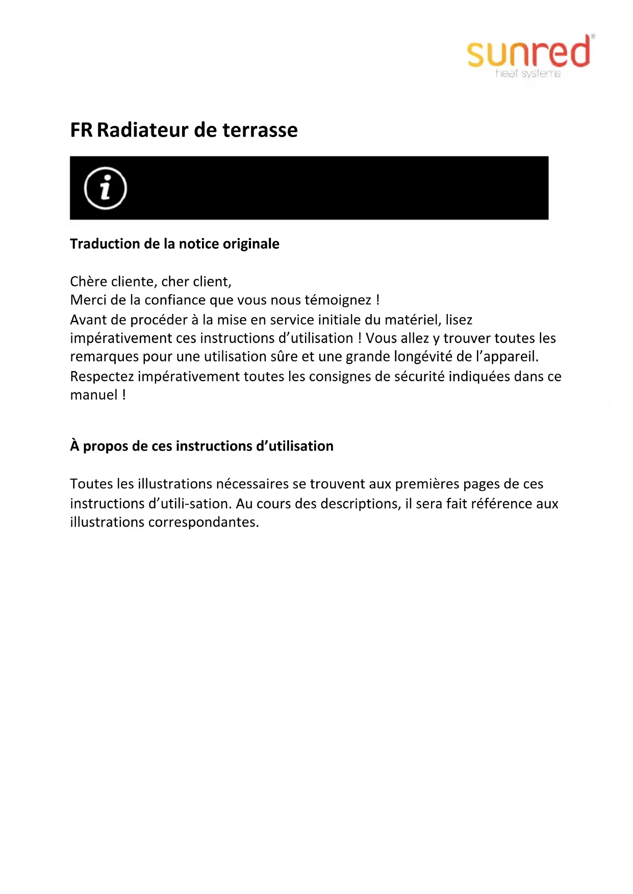 All measurements are approximate.FR Radiateur de terrasse Traduction de la notice originale Chère cliente, cher client, Merci de la confiance que vous nous témoignez ! Avant de procéder à la mise en service initiale du matériel, lisez impérativement ces instructions d’utilisation ! Vous allez y trouver toutes les remarques pour une utilisation sûre et une grande longévité de l’appareil. Respectez impérativement toutes les consignes de sécurité indiquées dans ce manuel ! À propos de ces instructions d’utilisation Toutes les illustrations nécessaires se trouvent aux premières pages de ces instructions d’utili-sation. Au cours des descriptions, il sera fait référence aux illustrations correspondantes.Avant de commencer… Utilisation conforme L’appareil répond aux toutes dernières acquisitions de la technique ainsi qu’aux normes de sécu-rité en vigueur au moment de sa mise en service dans le cadre de son utilisation conforme. L’appareil a été conçu comme appareil de chauffage sous abri extérieur. L’appareil est conçu pour un travail domestique et non artisanal. Toute autre utilisation est considérée comme non conforme. Un usage non conforme, des modi-fications de l’appareil ou l’utilisation de pièces non contrôlées et homologuées par le fabricant peuvent entraîner des dommages imprévisibles ! Toute utilisation non conforme à la destination de l’appareil ainsi que toutes les activités non décrites dans le mode d’emploi sont à considérer comme des utilisations incorrectes non cou-vertes par la garantie du fabricant. Pour votre sécurité Consignes générales de sécurité