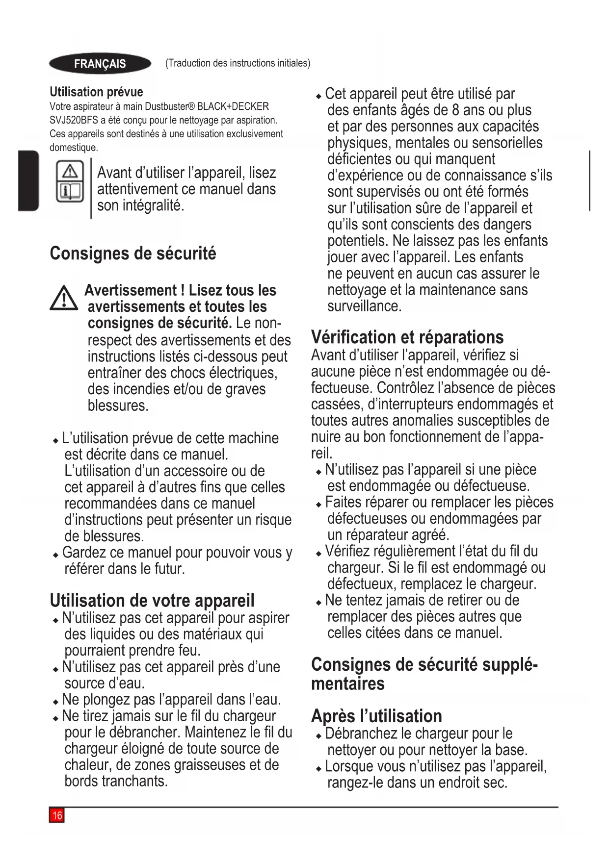 Avertissement ! Lisez tous les avertissements et toutes les consignes de sécurité. Le non- respect des avertissements et des instructions listés ci-dessous peut entraîner des chocs électriques, desincendieset/oudegraves blessures. u L’utilisation prévue de cette machine est décrite dans ce manuel. L’utilisation d’un accessoire ou de cetappareilàd’autresnsquecelles recommandées dans ce manuel d’instructions peut présenter un risque de blessures. u Gardez ce manuel pour pouvoir vous y référer dans le futur. Utilisation de votre appareil u N’utilisez pas cet appareil pour aspirer des liquides ou des matériaux qui pourraient prendre feu. u N’utilisez pas cet appareil près d’une source d’eau. u Ne plongez pas l’appareil dans l’eau.u Netirezjamaissurlelduchargeur pourledébrancher.Maintenezleldu chargeur éloigné de toute source de chaleur, de zones graisseuses et de bords tranchants. u Cet appareil peut être utilisé par des enfants âgés de 8 ans ou plus et par des personnes aux capacités physiques, mentales ou sensorielles décientesouquimanquent d’expérience ou de connaissance s’ils sont supervisés ou ont été formés sur l’utilisation sûre de l’appareil et qu’ils sont conscients des dangers potentiels. Ne laissez pas les enfants jouer avec l’appareil. Les enfants ne peuvent en aucun cas assurer le nettoyage et la maintenance sans surveillance. Vérication et réparations Avantd’utiliserl’appareil,vériezsi aucune pièce n’est endommagée ou dé- fectueuse. Contrôlez l’absence de pièces cassées, d’interrupteurs endommagés et toutes autres anomalies susceptibles de nuire au bon fonctionnement de l’appa- reil. u N’utilisez pas l’appareil si une pièce est endommagée ou défectueuse. u Faites réparer ou remplacer les pièces défectueuses ou endommagées par un réparateur agréé. u Vériezrégulièrementl’étatduldu chargeur.Silelestendommagéou défectueux, remplacez le chargeur. u Ne tentez jamais de retirer ou de remplacer des pièces autres que celles citées dans ce manuel. Consignes de sécurité supplé- mentaires Après l’utilisation u Débranchez le chargeur pour le nettoyer ou pour nettoyer la base. u Lorsque vous n’utilisez pas l’appareil, rangez-le dans un endroit sec.17 (Traduction des instructions initiales)FRANÇAIS u Les enfants ne doivent pas avoir accès aux appareils rangés. Risques résiduels Certains risques résiduels autres que ceux mentionnés dans les avertisse- ments sur la sécurité peuvent survenir en utilisant l’outil. Ces risques peuvent être provoqués par une utilisation incorrecte, prolongée, etc... Malgré l’application des normes de sécurité pertinentes et la présence de dispositifs de sécurité, certains risques résiduels ne peuvent pas être évités. Ils comprennent : u Les blessures dues au contact avec unepiècerotative/mobile. u Les blessures dues au remplacement de pièces, lames ou accessoires. u Les blessures dues à l’utilisation prolongée d’un outil. Lorsque l’outil est utilisé pendant de longues périodes, assurez-vous de faire des pauses régulières. u Perte de l’ouïe.u Les risques sanitaires dus à l’inhalation de poussières émises pendant l’utilisation de l’outil (exemple : travail avec du bois, surtout le chêne, le hêtre et les panneaux en MDF). Chargeurs Votre chargeur a été conçu pour une tensionspécique.Vérieztoujoursque la tension indiquée sur la plaque signa- létique de l’appareil correspond à la ten- sion du secteur. Avertissement ! N’essayez jamais de remplacer le chargeur par une prise sec- teur ordinaire. u N’utilisez votre chargeur BLACK+DECKER que pour recharger la batterie fournie avec l’appareil. D’autres batteries pourraient exploser et provoquer des blessures et des dommages. u Ne tentez jamais de recharger des piles non rechargeables. u Si le câble d’alimentation est endommagé, il doit être remplacé par le fabricant ou par un centre de réparation agréé BLACK+DECKER and’évitertoutaccident. u N’exposez pas le chargeur à l’eau.u N’ouvrez pas le chargeur.u Ne sondez pas le chargeur.u Pourlechargement,l’appareil/l’outil/ la batterie doivent être placés dans un endroit bien aéré. Sécurité électrique Symboles sur le chargeur Lisez attentivement et entièrement le manuel avant d’utiliser l’appareil.