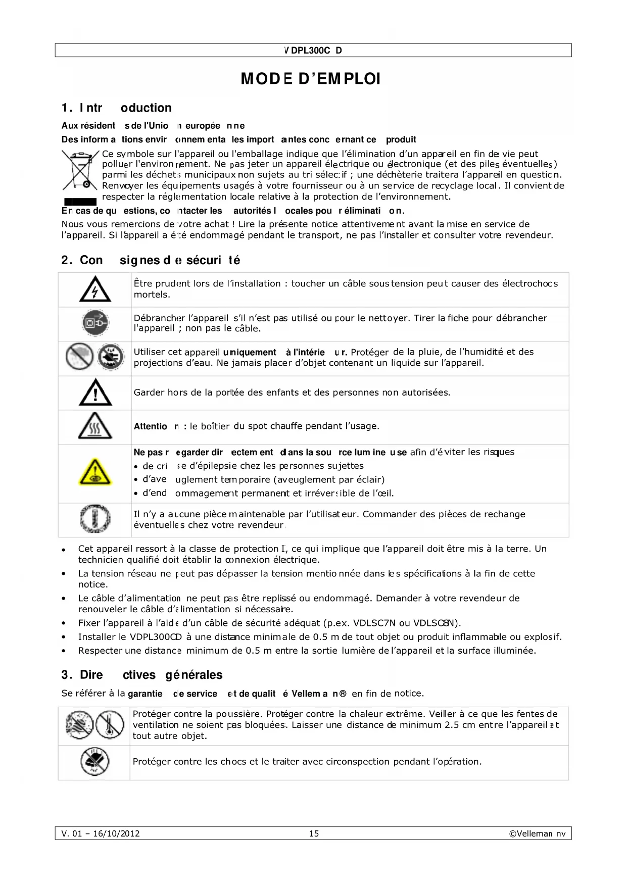 Garantie de service et de qualité Velleman® Depuis 1972, Velleman® a gagné une vaste expérience dans le secteur de l’électronique et est actuellement distributeur dans plus de 85 pays. Tous nos produits répondent à des exigences de qualité rigoureuses et à des dispositions légales en vigueur dans l’UE. Afin de garantir la qualité, nous soum ettons régulièrement nos produits à des contrôles de qualité supplémentaires, tant par notre propre service qualité que par un service qualité externe. Dans le cas improbable d’un défaut malgré toutes les précautions, il est possible d’invoquer notre garantie (voir les conditions de garantie). Conditions générales concernant la garantie sur les produits grand public ( pour l’UE) :