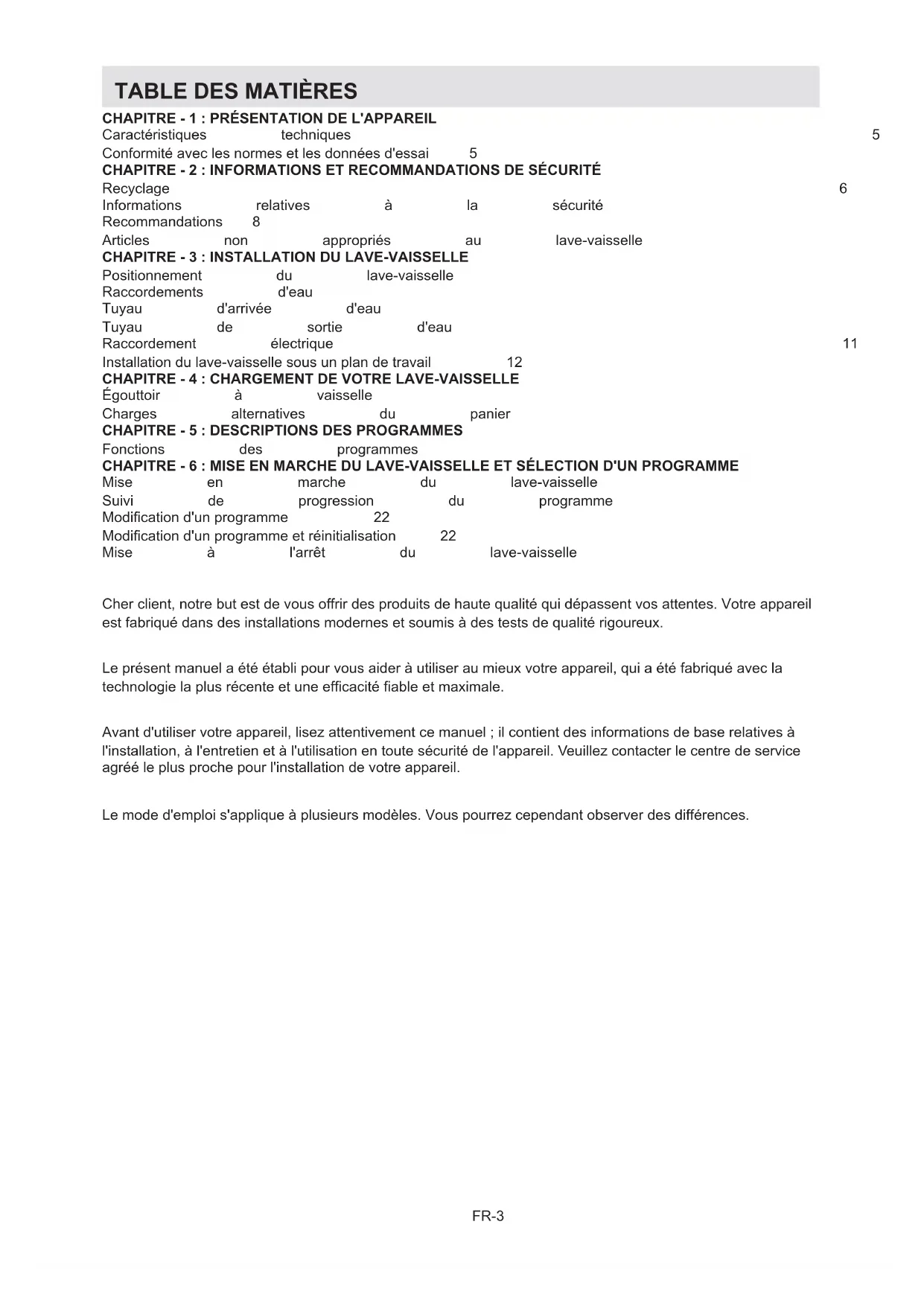 Fonctions des programmes 17 CHAPITRE - 6 : MISE EN MARCHE DU LAVE-VAISSELLE ET SÉLECTION D'UN PROGRAMME Mise en marche du lave-vaisselle 21 Suivi de progression du programme 21 Modication d'un programme 22 Modication d'un programme et réinitialisation 22 Mise à l'arrêt du lave-vaisselle 22 Cher client, notre but est de vous offrir des produits de haute qualité qui dépassent vos attentes. Votre appareil est fabriqué dans des installations modernes et soumis à des tests de qualité rigoureux. Le présent manuel a été établi pour vous aider à utiliser au mieux votre appareil, qui a été fabriqué avec la technologie la plus récente et une efcacité able et maximale. Avant d'utiliser votre appareil, lisez attentivement ce manuel ; il contient des informations de base relatives à l'installation, à l'entretien et à l'utilisation en toute sécurité de l'appareil. Veuillez contacter le centre de service agréé le plus proche pour l'installation de votre appareil. Le mode d'emploi s'applique à plusieurs modèles. Vous pourrez cependant observer des différences.FR-4