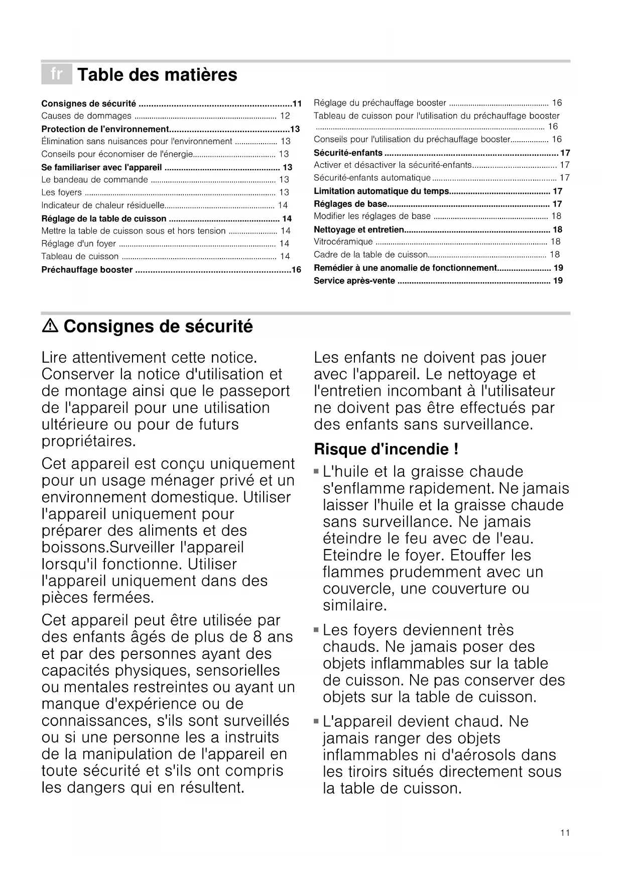 - Stellen Sie keine heißen Töpfe an oder auf das Bedienfeld11 Þ Table des matières [fr]Mode d’emploi Consignes de sécurité .............................................................11 Causes de dommages ................................................................... 12 Protection de l'environnement................................................13 Élimination sans nuisances pour l'environnement .................... 13 Conseils pour économiser de l'énergie....................................... 13 Se familiariser avec l'appareil ................................................. 13 Le bandeau de commande ........................................................... 13 Les foyers .......................................................................................... 13 Indicateur de chaleur résiduelle.................................................... 14 Réglage de la table de cuisson ............................................... 14 Mettre la table de cuisson sous et hors tension ....................... 14 Réglage d'un foyer .......................................................................... 14 Tableau de cuisson ......................................................................... 14 Préchauffage booster ..............................................................16 Réglage du préchauffage booster ............................................... 16 Tableau de cuisson pour l'utilisation du préchauffage booster