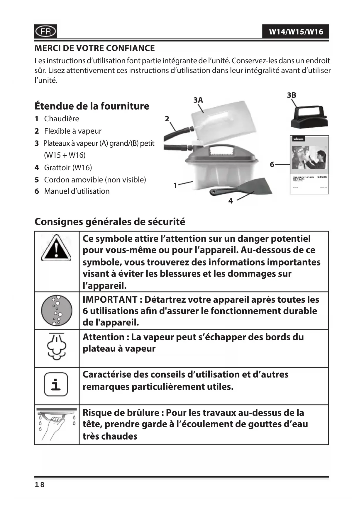 1 Chaudière 2 Flexible à vapeur 3 Plateaux à vapeur (A) grand/(B) petit (W15 + W16) 4 Grattoir (W16) 5 Cordon amovible (non visible) 6 Manuel d'utilisation