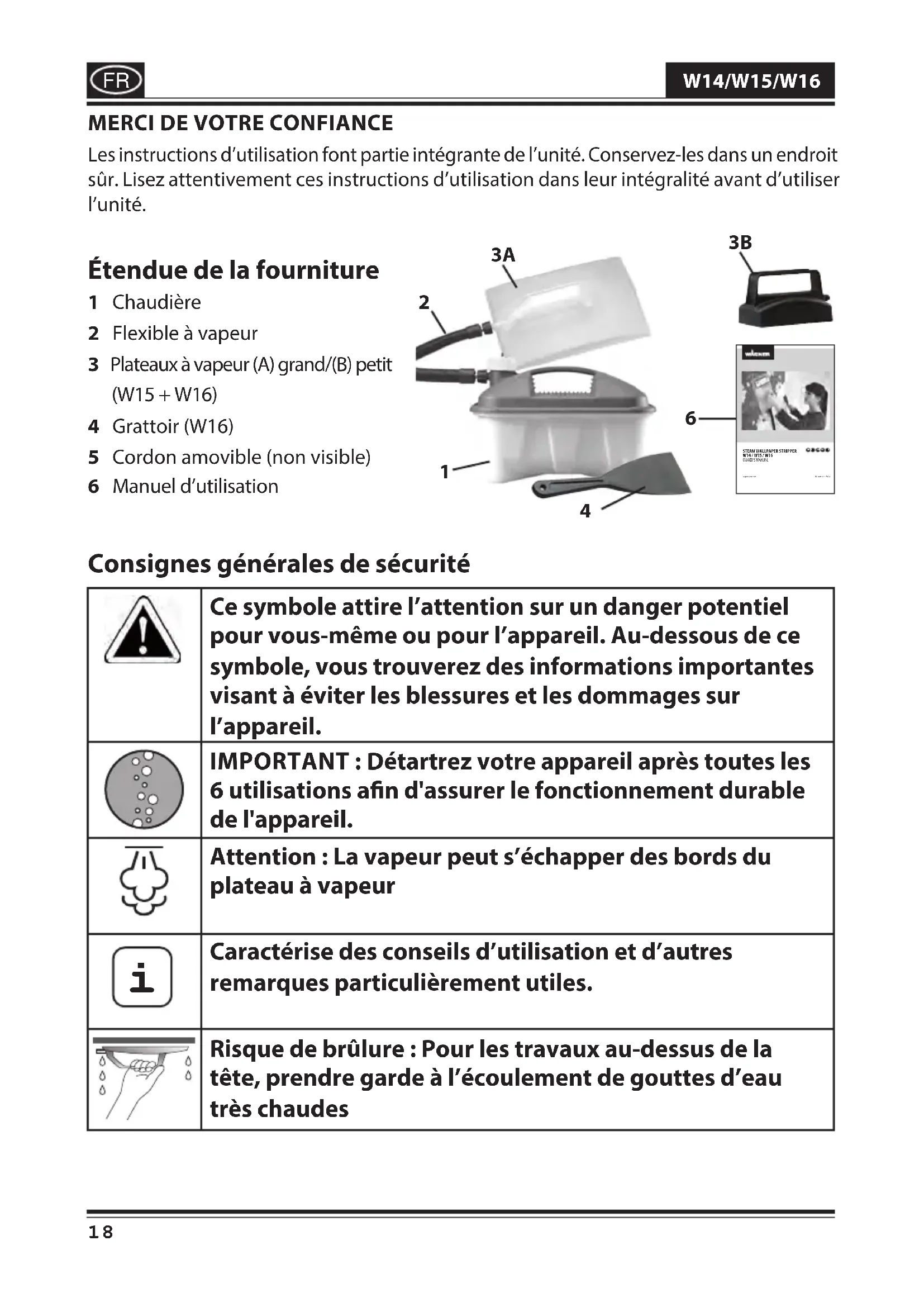 Les instructions d’utilisation font partie intégrante de l’unité. Conservez-les dans un endroit sûr. Lisez attentivement ces instructions d’utilisation dans leur intégralité avant d’utiliser l’unité. Étendue de la fourniture 1 Chaudière 2 Flexible à vapeur 3 Plateaux à vapeur (A) grand/(B) petit (W15 + W16) 4 Grattoir (W16) 5 Cordon amovible (non visible) 6 Manuel d’utilisation Consignes générales de sécurité Ce symbole attire l’attention sur un danger potentiel pour vous-même ou pour l’appareil Au-dessous de ce symbole, vous trouverez des informations importantes visant à éviter les blessures et les dommages sur l’appareil IMPORTANT : Détartrez votre appareil après toutes les 6 utilisations an d'assurer le fonctionnement durable de l'appareil Attention: La vapeur peut s’échapper des bords du plateau à vapeur
