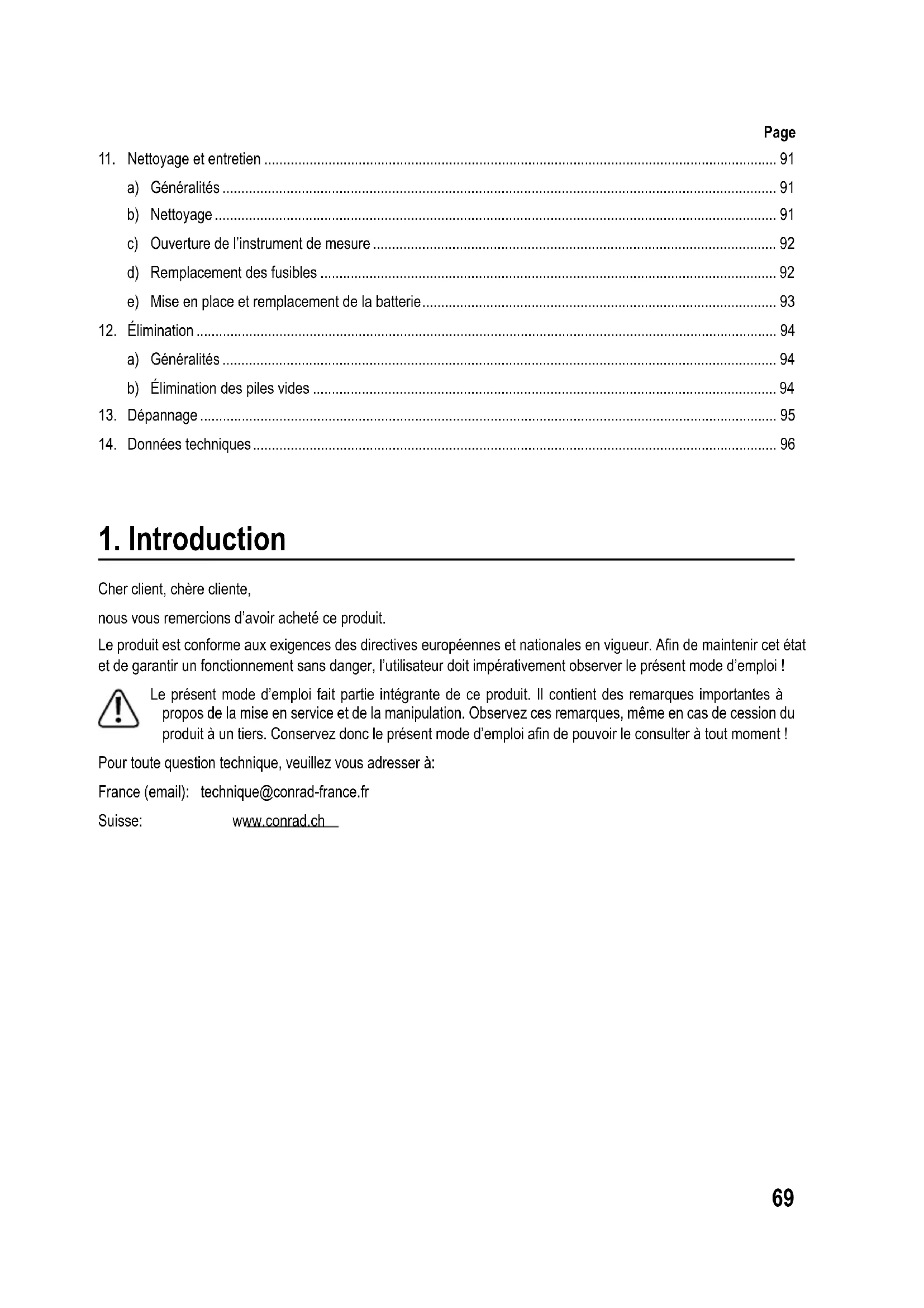 - Cher client, chère cliente, nous vous remercions d’avoir acheté ce produit. Leproduitestconformeauxexigencesdesdirectiveseuropéennesetnationalesenvigueur.Andemaintenircetétat et de garantir un fonctionnement sans danger, l’utilisateur doit impérativement observer le présent mode d’emploi ! Le présent mode d’emploi fait partie intégrante de ce produit. Il contient des remarques importantes à propos de la mise en service et de la manipulation. Observez ces remarques, même en cas de cession du produitàuntiers.Conservezdoncleprésentmoded’emploiandepouvoirleconsulteràtoutmoment! Pour toute question technique, veuillez vous adresser à: France (email): technique@conrad-france.fr Suisse: www.conrad.ch Page 11. Nettoyage et entretien p. 91
