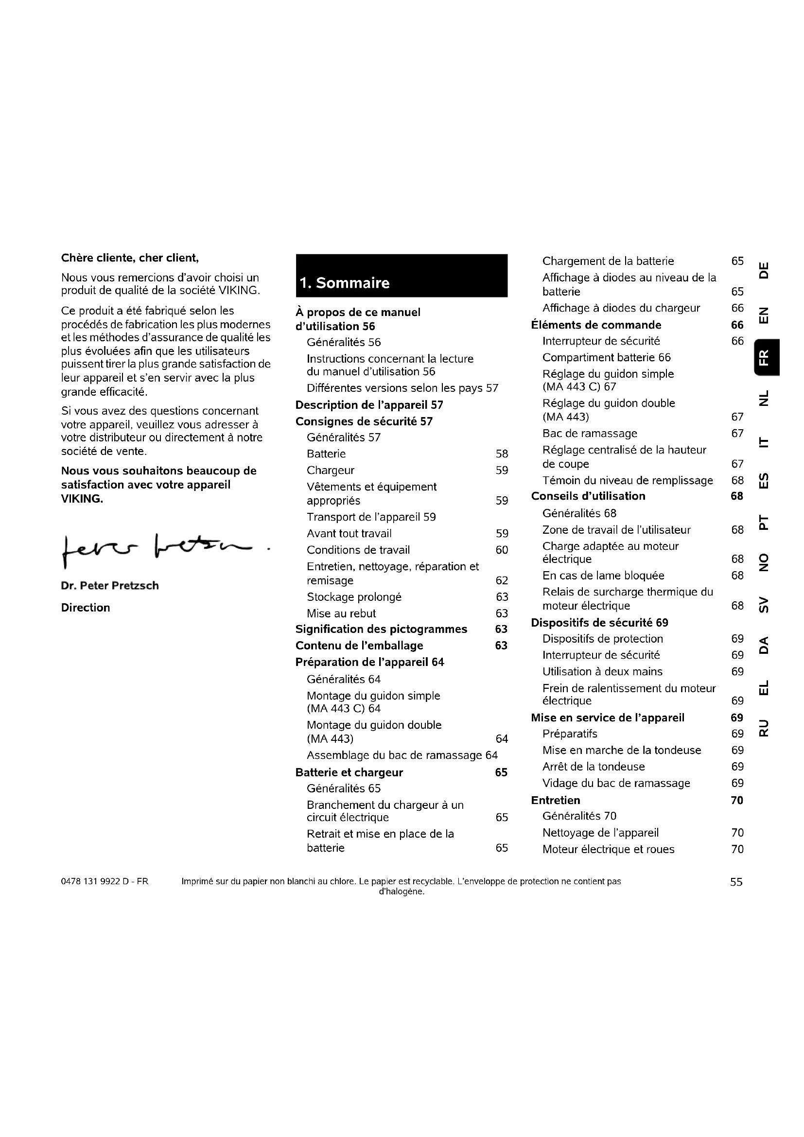DEENNLITESPTNOSVDAELRU FR 0478 131 9922 D - FR Chère cliente, cher client, Nous vous remercions d’avoir choisi un produit de qualité de la société VIKING. Ce produit a été fabriqué selon les procédés de fabrication les plus modernes et les méthodes d’assurance de qualité les plus évoluées afin que les utilisateurs puissent tirer la plus grande satisfaction de leur appareil et s’en servir avec la plus grande efficacité. Si vous avez des questions concernant votre appareil, veuillez vous adresser à votre distributeur ou directement à notre société de vente. Nous vous souhaitons beaucoup de satisfaction avec votre appareil VIKING. Direction Imprimé sur du papier non blanchi au chlore. Le papier est recyclable. L’enveloppe de protection ne contient pas d’halogène.