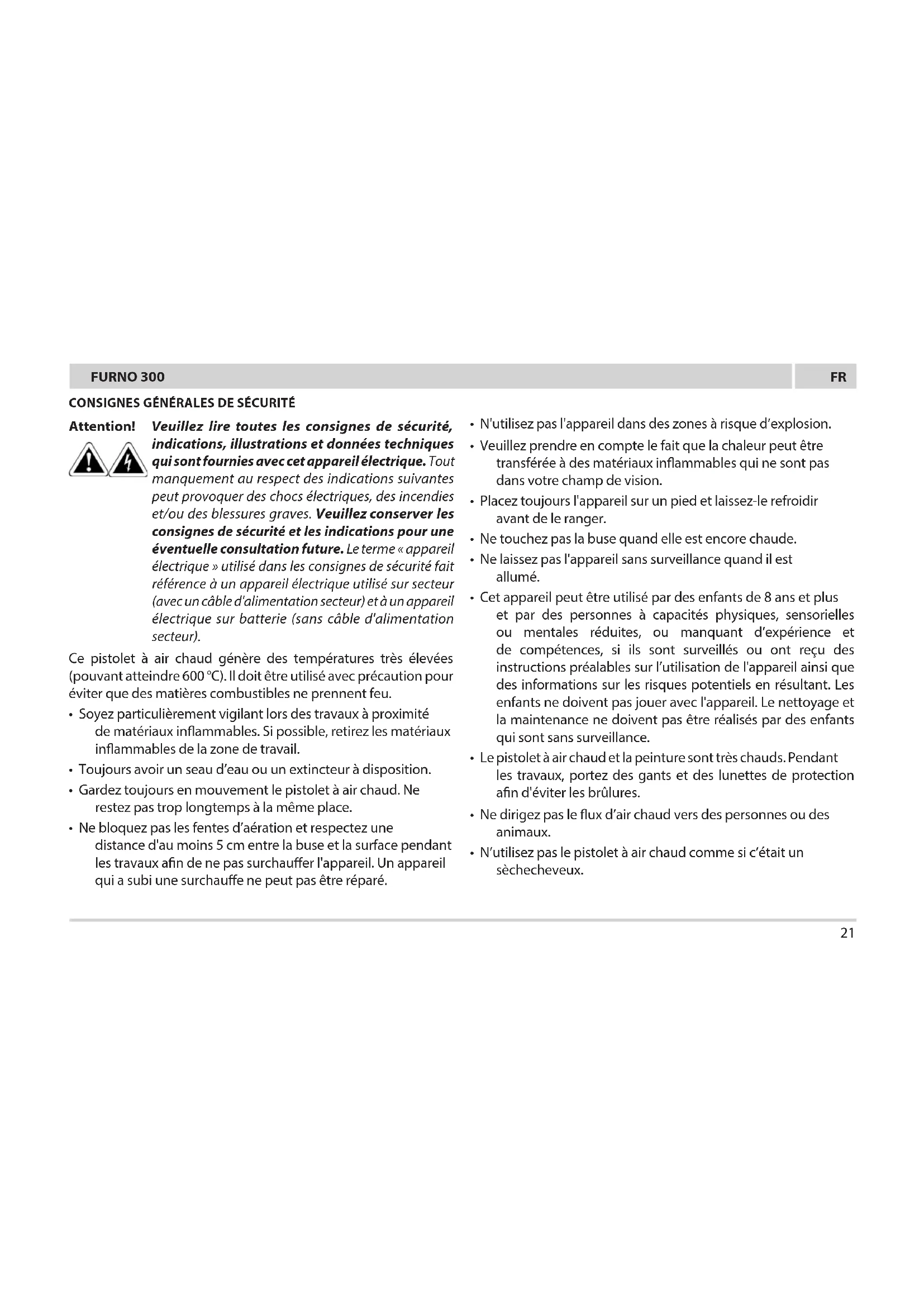 CONSIGNES GÉNÉRALES DE SÉCURITÉ Attention! Veuillez lire toutes les consignes de sécurité, indications, illustrations et données techniques qui sont fournies avec cet appareil électrique. Tout manquement au respect des indications suivantes peut provoquer des chocs électriques, des incendies et/ou des blessures graves. Veuillez conserver les consignes de sécurité et les indications pour une éventuelle consultation future. Le terme « appareil électrique » utilisé dans les consignes de sécurité fait référence à un appareil électrique utilisé sur secteur (avec un câble d'alimentation secteur) et à un appareil électrique sur batterie (sans câble d'alimentation secteur). Ce pistolet à air chaud génère des températures très élevées (pouvant atteindre 600 °C). Il doit être utilisé avec précaution pour éviter que des matières combustibles ne prennent feu.