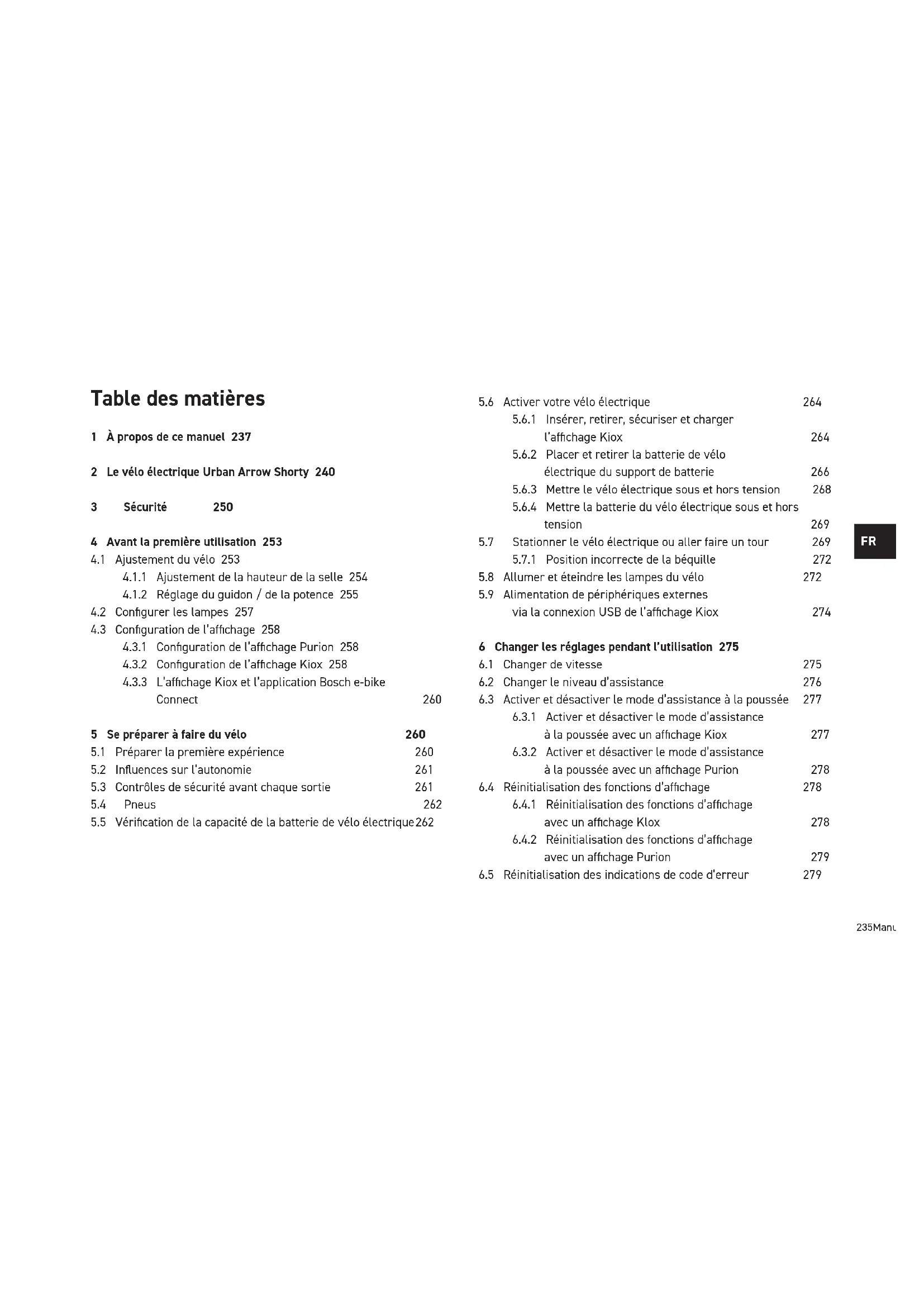 Table des matières 1 À propos de ce manuel 237 2 Le vélo électrique Urban Arrow Shorty 240 3 Sécurité 250 4 Avant la première utilisation 253
