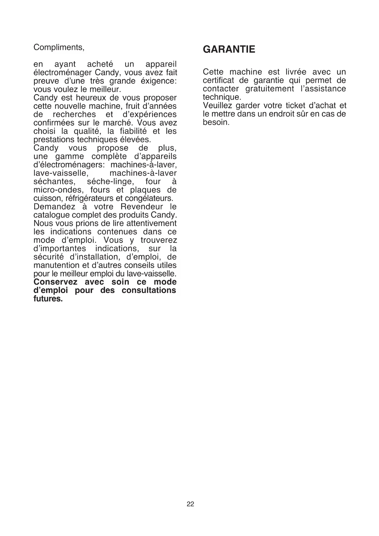 50°C/ 60°C 45°C/ 55°C22 Compliments, en ayant acheté un appareil électroménager Candy, vous avez fait preuve d’une très grande éxigence: vous voulez le meilleur. Candy est heureux de vous proposer cette nouvelle machine, fruit d’années de recherches et d’expériences confirmées sur le marché. Vous avez choisi la qualité, la fiabilité et les prestations techniques élevées. Candy vous propose de plus, une gamme complète d’appareils d’électroménagers: machines-à-laver, lave-vaisselle, machines-à-laver séchantes, séche-linge, four à micro-ondes, fours et plaques de cuisson, réfrigérateurs et congélateurs. Demandez à votre Revendeur le catalogue complet des produits Candy. Nous vous prions de lire attentivement les indications contenues dans ce mode d’emploi. Vous y trouverez d’importantes indications, sur la sécurité d’installation, d’emploi, de manutention et d’autres conseils utiles pour le meilleur emploi du lave-vaisselle. Conservez avec soin ce mode d’emploi pour des consultations futures. GARANTIE Cette machine est livrée avec un certificat de garantie qui permet de contacter gratuitement l’assistance technique. Veuillez garder votre ticket d’achat et le mettre dans un endroit sûr en cas de besoin.23