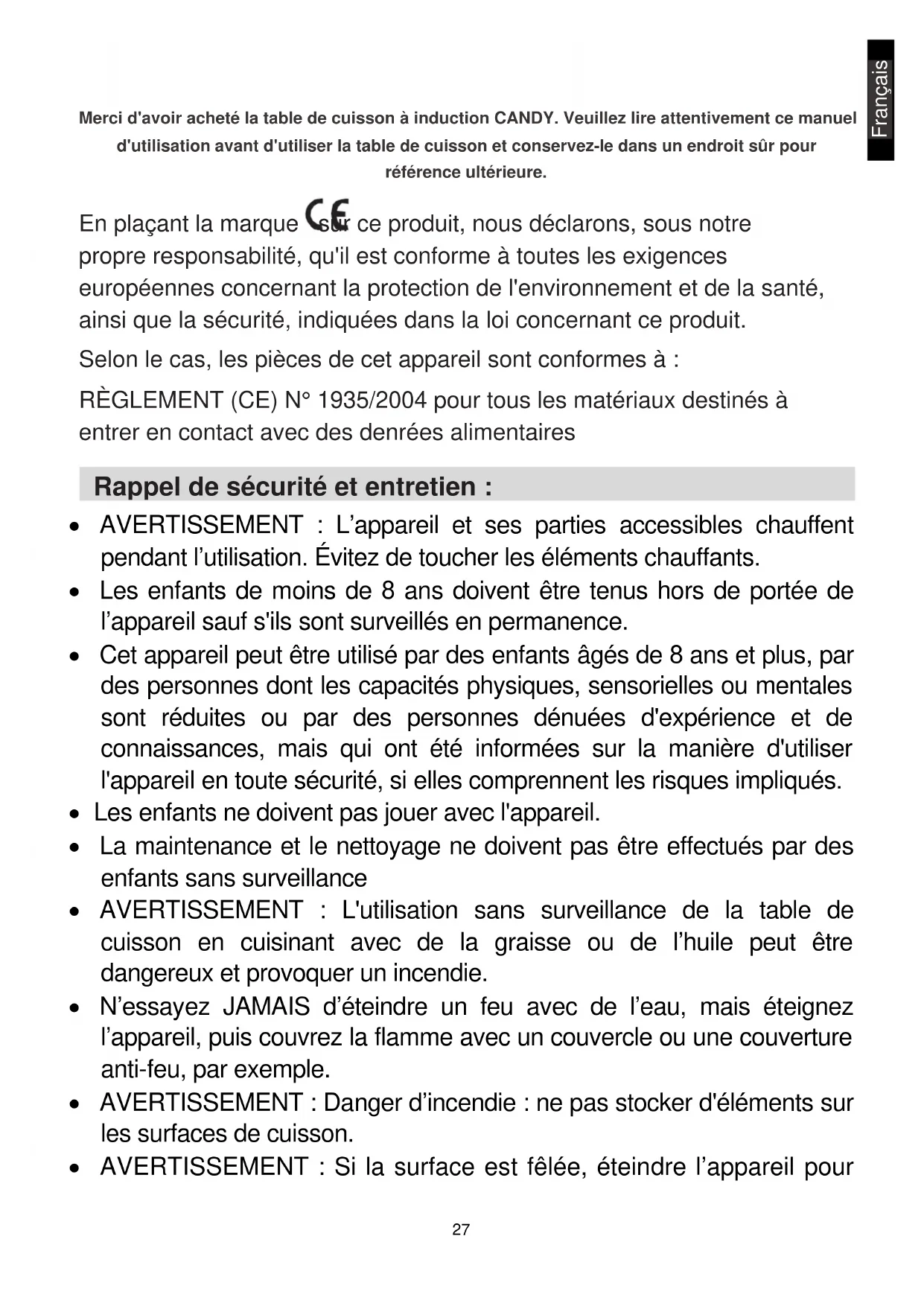 Dichiarazione speciale Il contenuto di questo manuale è stato attentamente controllato. Tuttavia, l'azienda non può essere ritenuta responsabile per eventuali errori di stampa o omissioni. Inoltre, qualsiasi modifica tecnica può essere inclusa in una versione riveduta del manuale senza preavviso. L'aspetto e il colore dell'elettrodomestico possono differire da quelli indicati nel presente manuale.27 Français Merci d'avoir acheté la table de cuisson à induction CANDY. Veuillez lire attentivement ce manuel d'utilisation avant d'utiliser la table de cuisson et conservez-le dans un endroit sûr pour référence ultérieure. En plaçant la marque sur ce produit, nous déclarons, sous notre propre responsabilité, qu'il est conforme à toutes les exigences européennes concernant la protection de l'environnement et de la santé, ainsi que la sécurité, indiquées dans la loi concernant ce produit. Selon le cas, les pièces de cet appareil sont conformes à : RÈGLEMENT (CE) N° 1935/2004 pour tous les matériaux destinés à entrer en contact avec des denrées alimentaires Rappel de sécurité et entretien :