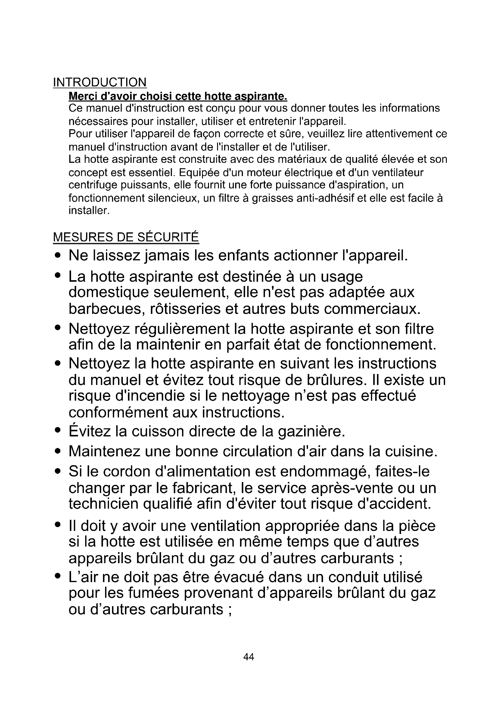 43INTRODUCTION Merci d'avoir choisi cette hotte aspirante. Ce manuel d'instruction est conçu pour vous donner toutes les informations nécessaires pour installer, utiliser et entretenir l'appareil. Pour utiliser l'appareil de façon correcte et sûre, veuillez lire attentivement ce manuel d'instruction avant de l'installer et de l'utiliser. La hotte aspirante est construite avec des matériaux de qualité élevée et son concept est essentiel. Equipée d'un moteur électrique et d'un ventilateur centrifuge puissants, elle fournit une forte puissance d'aspiration, un fonctionnement silencieux, un filtre à graisses anti-adhésif et elle est facile à installer.