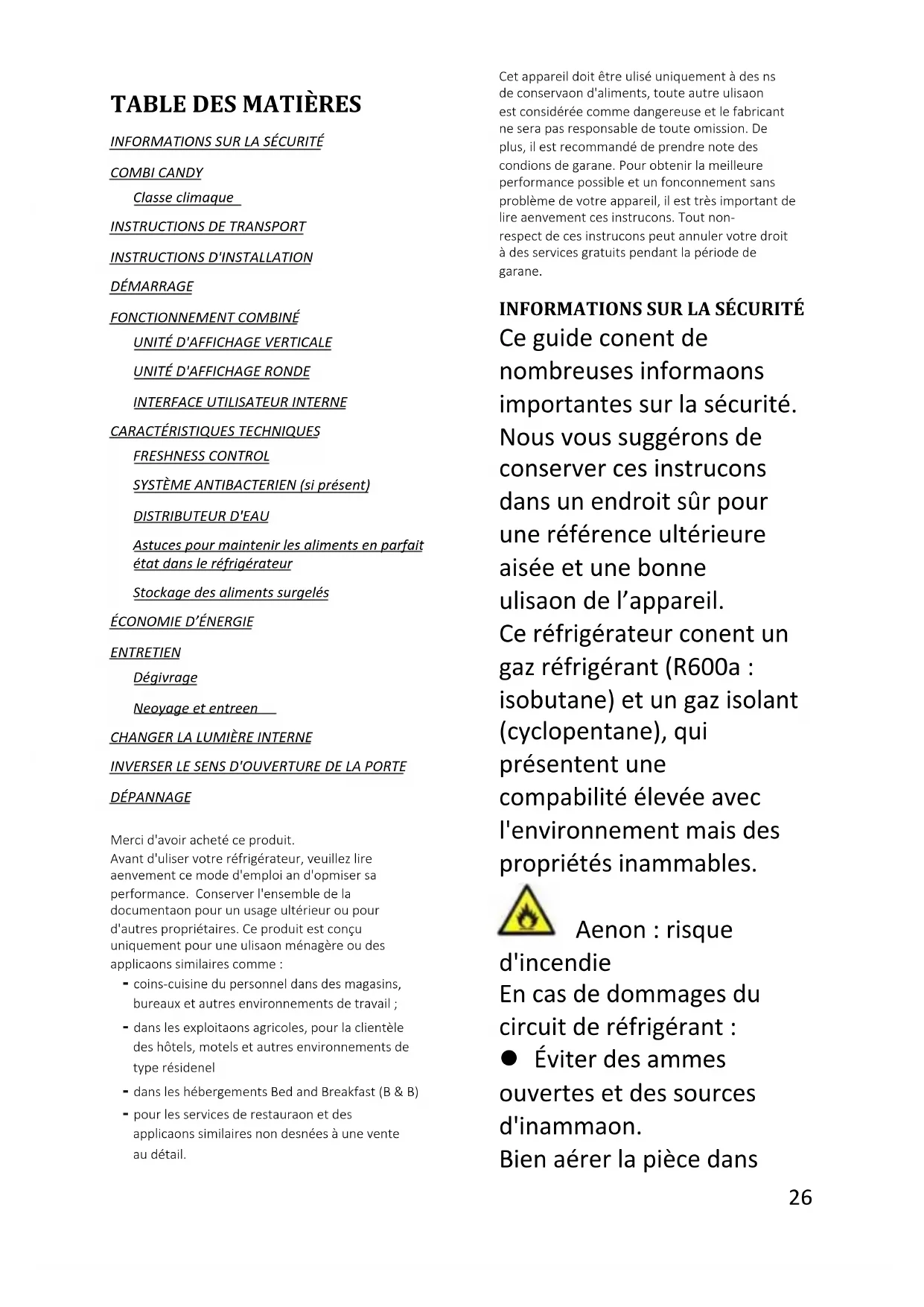 Cet apparéil doit être utilisé uniquement à des ns de conservaon d'aliments, toute autre ulisaon est considérée comme dangereuse et le fabricant ne sera pas responsable de toute omission. De plus, il est recommendé de prendre note des conditions de garane. Pour obtenir la meilleure performance possible et un fonconnement sans problème de votre apparéil, il est très important de dire avenvement ces instrucons. Tout non-respect de ces instrucons peut annuler votre droit à des services Gratisants pendant la période de garane.
