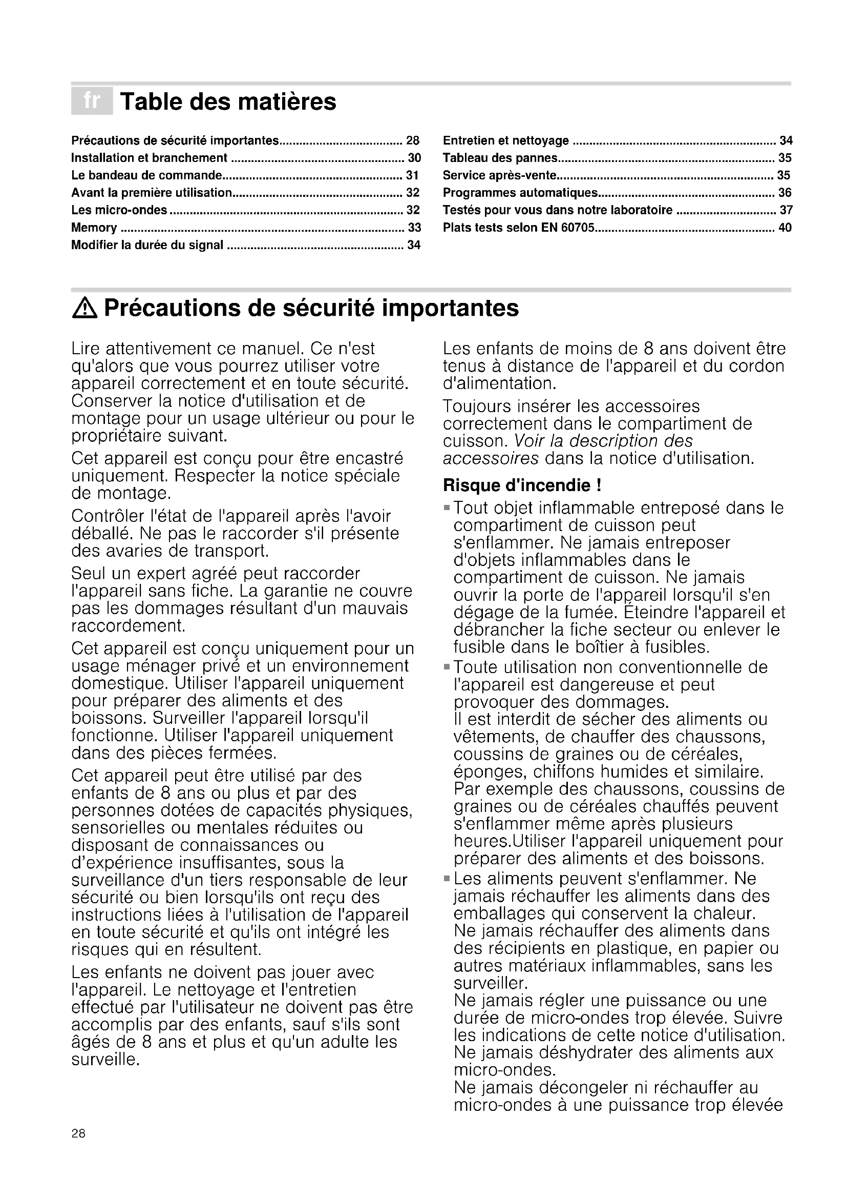 - Testgerechten volgens EN 60705 : Belangrijke veiligheidsvoorschriften Lees deze gebruiksaanwijzing zorgvuldig door. Alleen dan kunt u uw apparaat goed en veilig bedienen. Bewaar de gebruiksaanwijzing voor later gebruik of om door te geven aan een volgende eigenaar. Dit apparaat is alleen bestemd voor inbouw. Neem het speciale installatievoorschrift in acht. Controleer het apparaat na het uitpakken. Niet aansluiten in geval van transportschade. Alleen een daartoe bevoegd vakman mag apparaten zonder stekker aansluiten. Bij schade door een verkeerde aansluiting maakt u geen aanspraak op garantie. Dit apparaat is alleen bestemd voor huishoudelijk gebruik en de huiselijke omgeving. Gebruik het uitsluitend voor het bereiden van gerechten en drank. Zorg ervoor dat het apparaat onder toezicht gebruikt wordt. Het toestel alleen gebruiken in gesloten ruimtes. Dit toestel kan worden gebruikt door kinderen vanaf 8 jaar en door personen met beperkte fysieke, sensorische of geestelijke vermogens of personen die gebrek aan kennis of ervaring hebben, wanneer zij onder toezicht staan van een persoon die verantwoordelijk is voor hun veiligheid of geleerd hebben het op een veilige manier te gebruiken en zich bewust zijn van de risico's die het gebruik van het toestel met zich meebrengt. Kinderen mogen niet met het apparaat spelen. Reiniging en onderhoud van het toestel mogen niet worden uitgevoerd door kinderen, tenzij zij 8 jaar of ouder zijn en onder toezicht staan. Zorg ervoor dat kinderen die jonger zijn dan 8 jaar uit de buurt blijven van het toestel of de aansluitkabel. Toebehoren altijd op de juiste manier in de binnenruimte plaatsen. Zie beschrijving toebehoren in de gebruiksaanwijzing. Risico van brand! p. 53