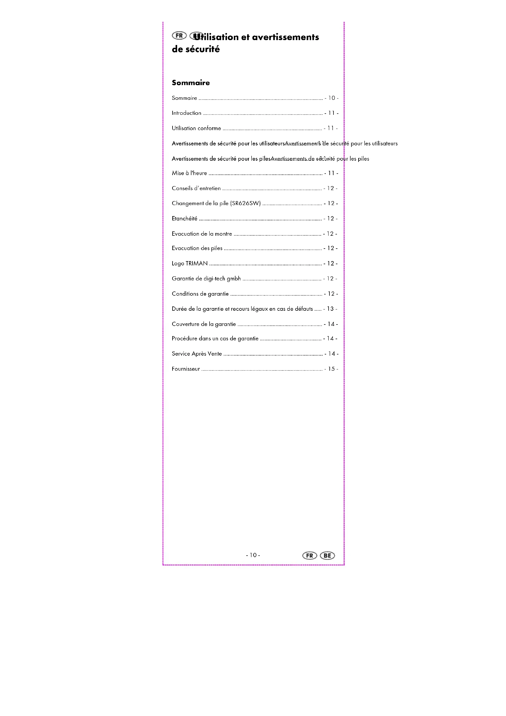 Utilisation et avertissements de sécurité Sommaire Sommaire ..................................................................................... - 10 - Introduction .................................................................................. - 11 - Utilisation conforme .................................................................... - 11 - Avertissements de sécurité pour les utilisateurs Avertissements de sécurité pour les utilisateursAvertissements de sécurité pour les utilisateurs Avertissements de sécurité pour les utilisateurs .................. - 11 - Avertissements de sécurité pour les piles Avertissements de sécurité pour les pilesAvertissements de sécurité pour les piles Avertissements de sécurité pour les piles ............................. - 11 - Mise à l'heure .............................................................................. - 11 - Conseils d’entretien .................................................................... - 12 - Changement de la pile (SR626SW) ......................................... - 12 - Etanchéité .................................................................................... - 12 - Evacuation de la montre ............................................................ - 12 - Evacuation des piles ................................................................... - 12 - Logo TRIMAN ............................................................................. - 12 - Garantie de digi-tech gmbh ...................................................... - 12 - Conditions de garantie ............................................................... - 12 - Durée de la garantie et recours légaux en cas de défauts ..... - 13 - Couverture de la garantie .......................................................... - 14 - Procédure dans un cas de garantie .......................................... - 14 - Service Après Vente .................................................................... - 14 - Fournisseur ................................................................................... - 15 --