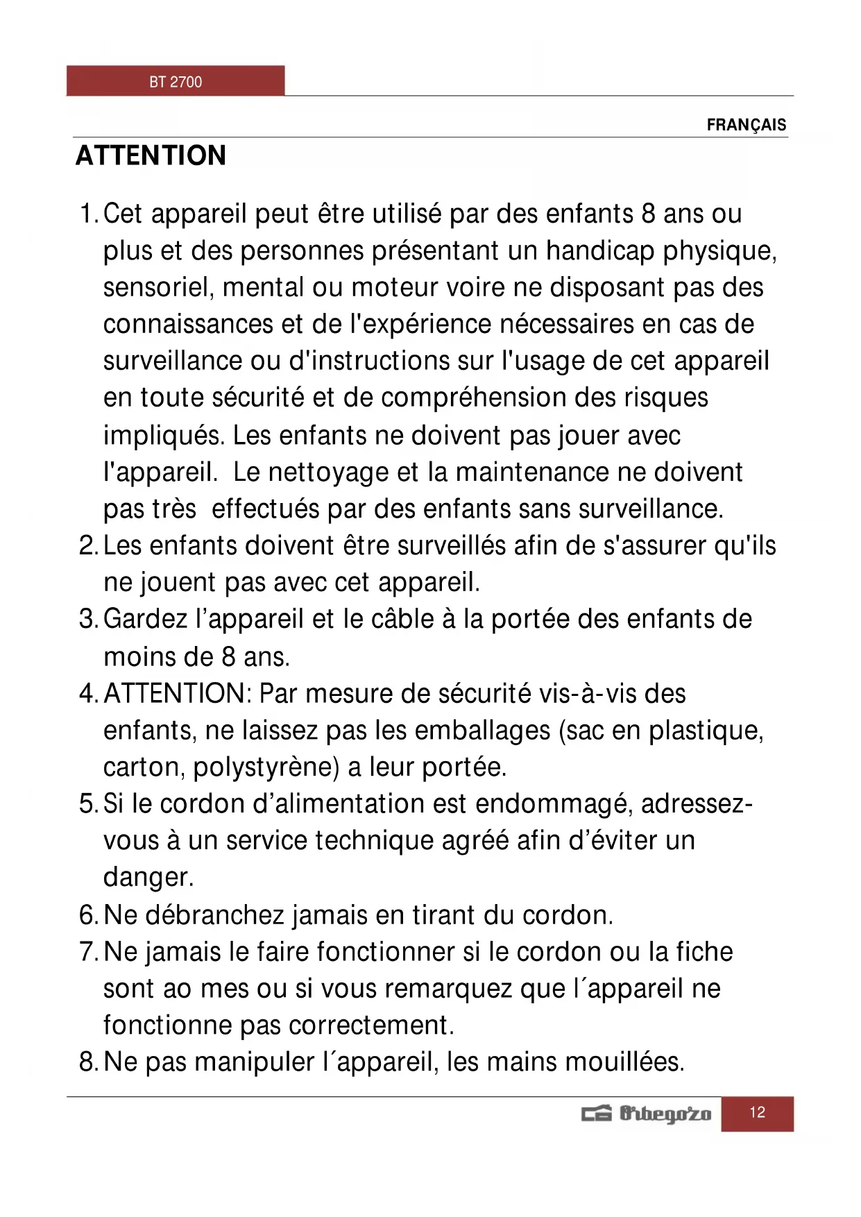 8. Ne pas manipuler l´appareil, les mains mouillées.BT 2700
