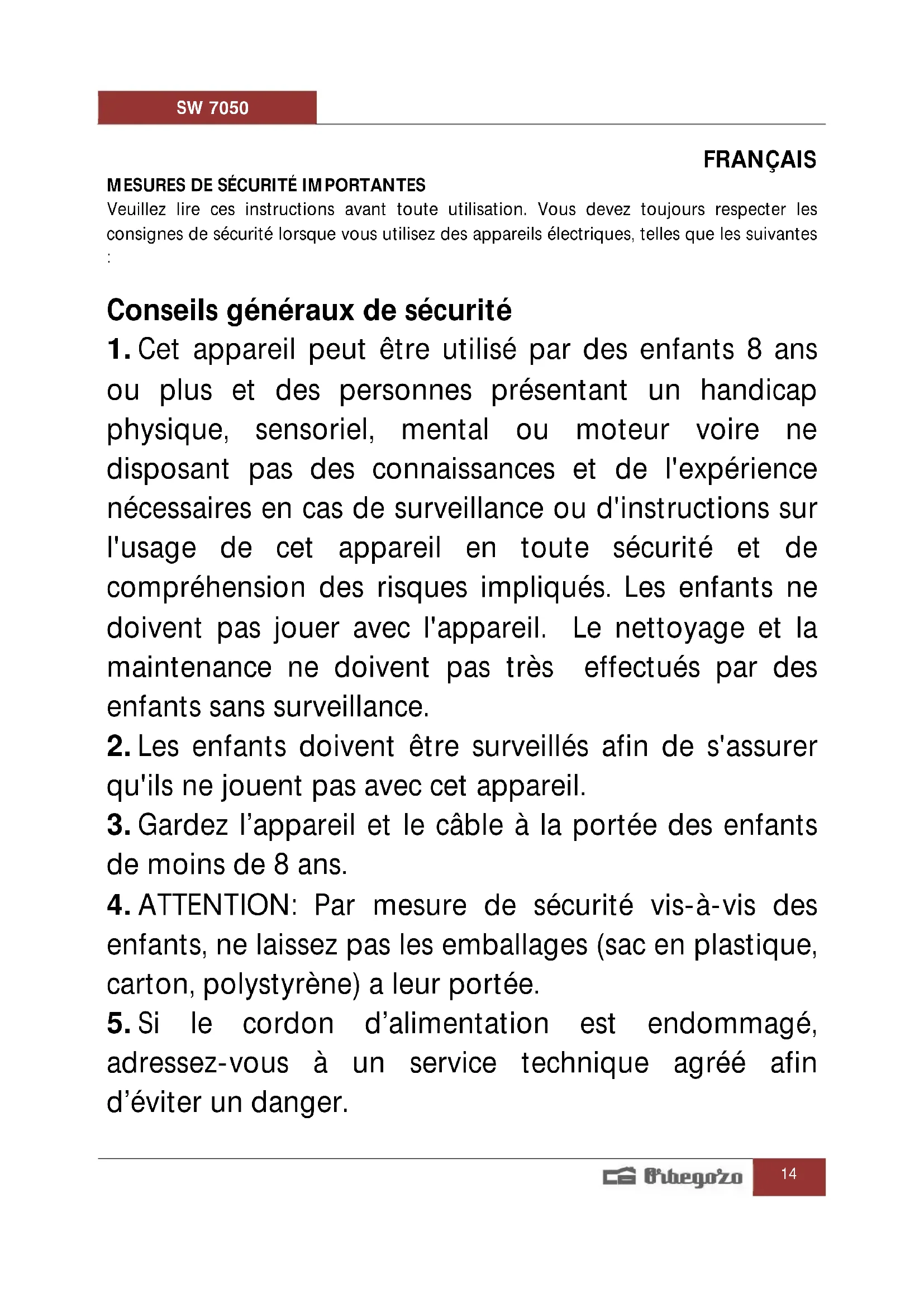 Retrouvez gratuitement la notice de l'appareil SW 7050 Orbegozo au format PDF.