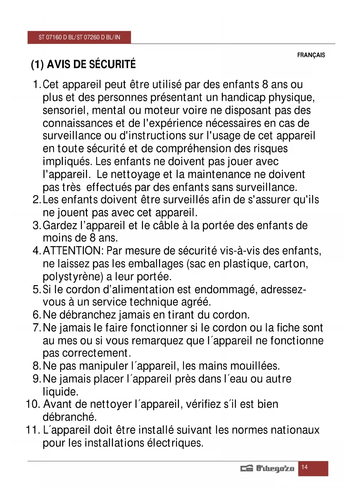 MODE D'EMPLOI ST 07260 D IN Orbegozo