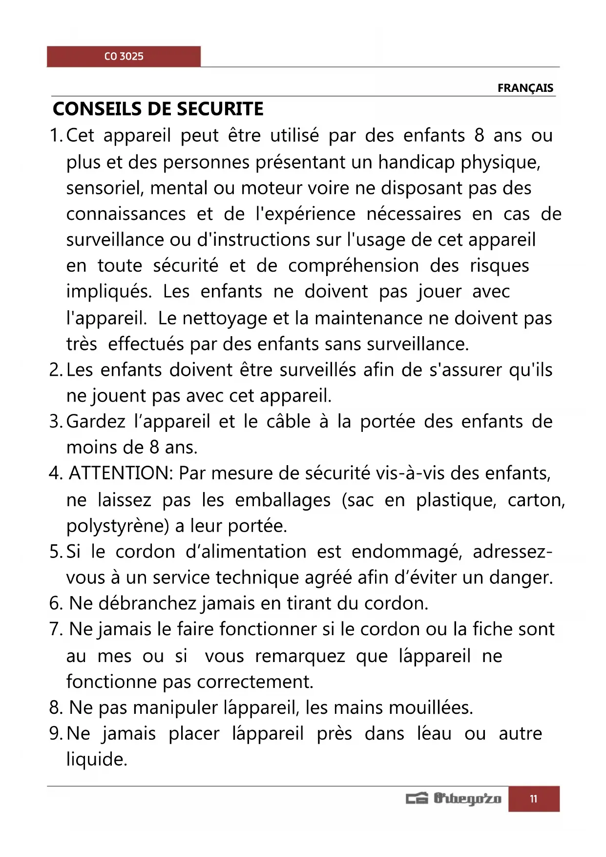La directive européenne 2012/19/EU sur les Déchets des Equipements Electriques et Electroniques (DEEE), exige que les appareils ménagers usages ne soient pas jetés dans le flux normal des déchets municipaux. Les appareils usagés doivent être collectés séparément afin d’optimiser le taux de récupération et le recyclage des matériaux qui les composent, et réduire l’impact sur la santé humaine et l’environnement. Le symbole de la poubelle barrée est apposée sur tous les produits pour rappeler les obligations de collète séparée. Les consommateurs devront contacter les autorités locales ou leur revendeur concernant la démarche à suivre pour l’enlèvement de leur vieil appareil. DÉCLARATION DE CONFORMITÉ: Cet appareil est conforme aux exigences de la Directive Basse Tension 2014/35/EU et aux exigences de la directive EMC 2014/30/EU. GARANTIE Cet appareil est couvert et bénéficie de la garantie légale conformément à la législation en vigueur à compter de la date d'achat. Conservez le reçu d'achat pour pouvoir faire valoir votre droit à la garantie. Pour trouver le service le plus proche de votre emplacement, contactez via le lien Web suivant : https://orbegozo.com/asistencia-tecnica/ Pour tout type de requête, doute ou incident, vous pouvez nous contacter via notre e-mail indiqué sur la page principale de ce manuel ou via notre service d'assistance technique à https://orbegozo.com/contacto/ Orbegozo n'est pas responsable des composants et accessoires soumis à l'usure due à l'utilisation, ainsi que des composés périssables ou de ceux qui se sont détériorés en raison d'une mauvaise utilisation. Il ne sera pas non plus tenu responsable si le propriétaire a modifié techniquement l'appareil. Consultez les conditions légales sur notre site.CO 3025