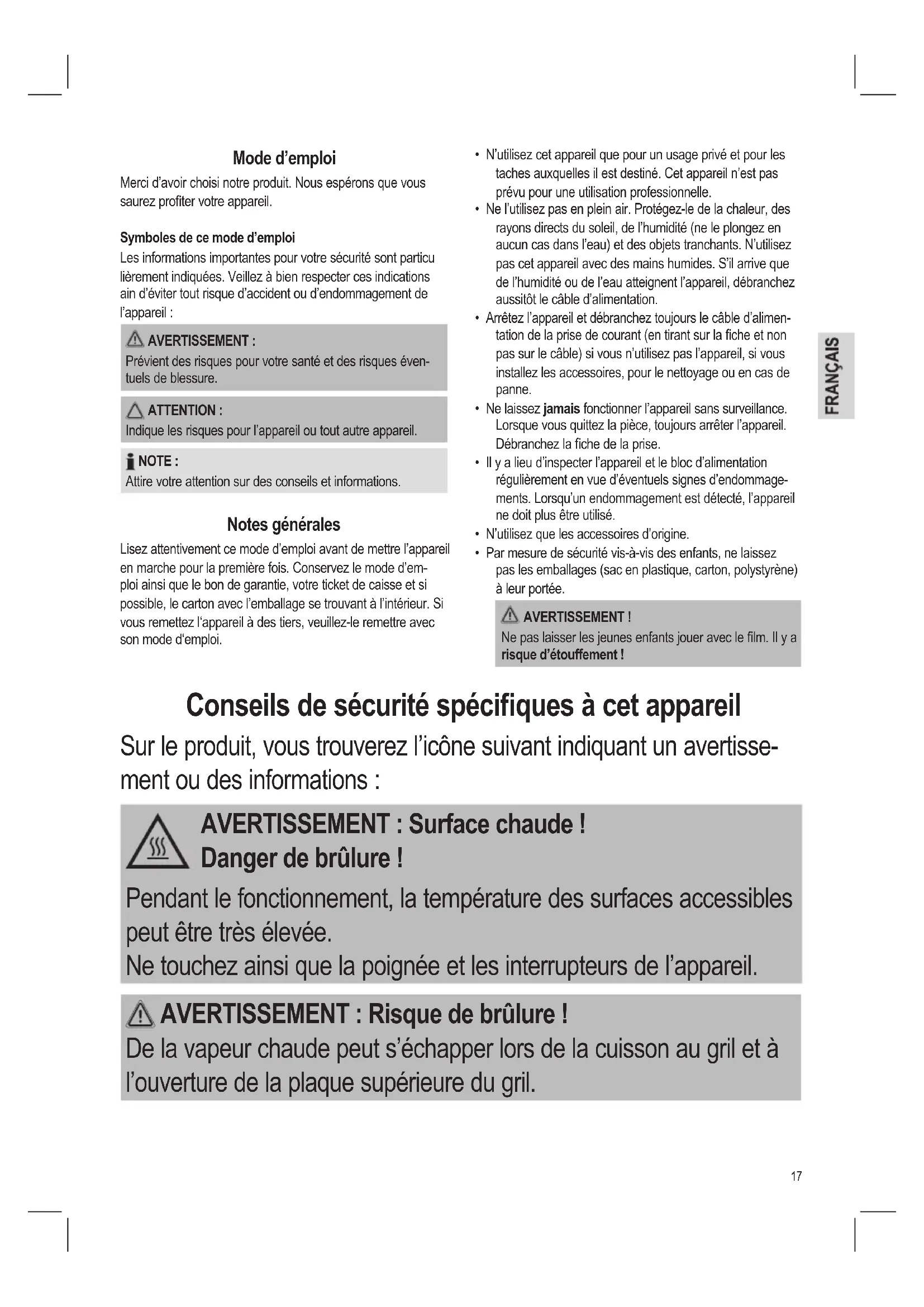 De la vapeur chaude peut s’échapper lors de la cuisson au gril et à l’ouverture de la plaque supérieure du gril.18 ATTENTION : Risque d’incendie ! Lorsqu’elles sont trop chauffées, l’huile et la matière grasse peuvent brûler. Conservez une distance de sécurité sufsante (30 cm) par rapport aux objets inammables comme le mobilier, les rideaux, etc.