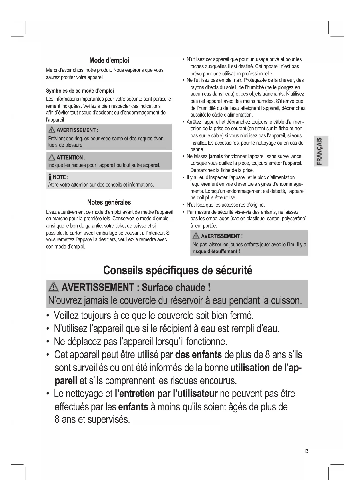 - Par mesure de sécurité vis-à-vis des enfants, ne laissez pas les emballages (sac en plastique, carton, polystyrène) à leur portée. AVERTISSEMENT ! Ne pas laisser les jeunes enfants jouer avec le lm. Il y a risque d’étouffement ! Mode d’emploi Merci d’avoir choisi notre produit. Nous espérons que vous saurez proter votre appareil. Symboles de ce mode d’emploi Les informations importantes pour votre sécurité sont particuliè- rement indiquées. Veillez à bien respecter ces indications an d’éviter tout risque d’accident ou d’endommagement de l’appareil :