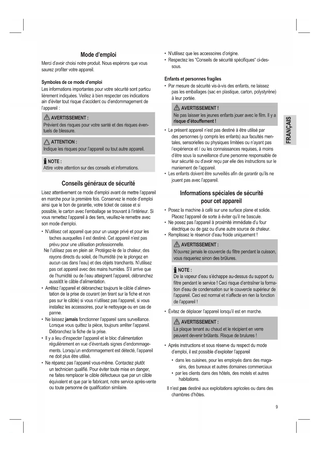 Prévient des risques pour votre santé et des risques éven- tuels de blessure. ATTENTION : Indique les risques pour l’appareil ou tout autre appareil. NOTE : Attire votre attention sur des conseils et informations. Conseils généraux de sécurité Lisez attentivement ce mode d’emploi avant de mettre l’appareil en marche pour la première fois. Conservez le mode d’emploi ainsi que le bon de garantie, votre ticket de caisse et si possible, le carton avec l’emballage se trouvant à l’intérieur. Si vous remettez l‘appareil à des tiers, veuillez-le remettre avec son mode d‘emploi.