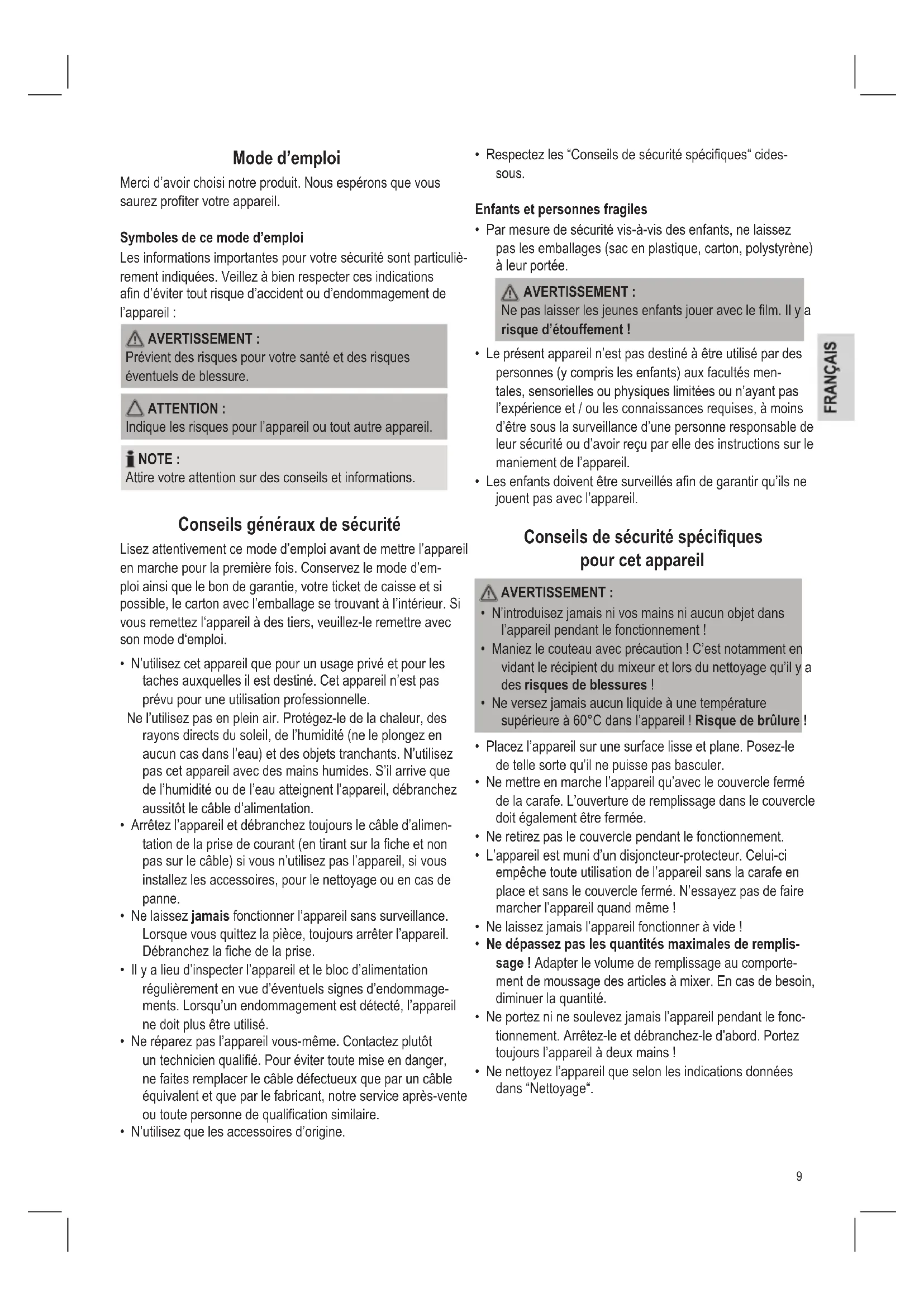 Prévient des risques pour votre santé et des risques éventuels de blessure. ATTENTION : Indique les risques pour l’appareil ou tout autre appareil. NOTE : Attire votre attention sur des conseils et informations. Conseils généraux de sécurité Lisez attentivement ce mode d’emploi avant de mettre l’appareil en marche pour la première fois. Conservez le mode d’em- ploi ainsi que le bon de garantie, votre ticket de caisse et si possible, le carton avec l’emballage se trouvant à l’intérieur. Si vous remettez l‘appareil à des tiers, veuillez-le remettre avec son mode d‘emploi.