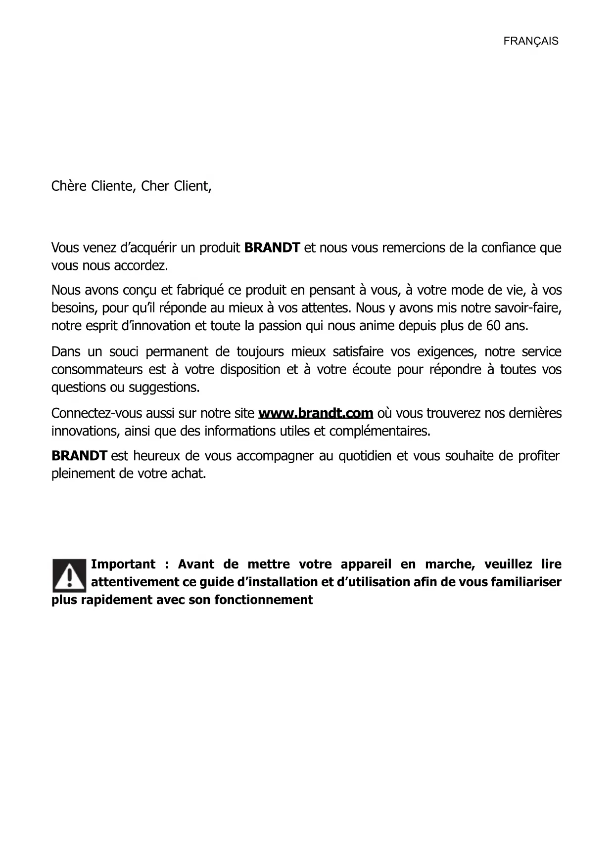 6FRANÇAIS Chère Cliente, Cher Client, Vous venez d’acquérir un produit BRANDT et nous vous remercions de la confiance que vous nous accordez. Nous avons conçu et fabriqué ce produit en pensant à vous, à votre mode de vie, à vos besoins, pour qu’il réponde au mieux à vos attentes. Nous y avons mis notre savoir-faire, notre esprit d’innovation et toute la passion qui nous anime depuis plus de 60 ans. Dans un souci permanent de toujours mieux satisfaire vos exigences, notre service consommateurs est à votre disposition et à votre écoute pour répondre à toutes vos questions ou suggestions. Connectez-vous aussi sur notre site www.brandt.com où vous trouverez nos dernières innovations, ainsi que des informations utiles et complémentaires. BRANDT est heureux de vous accompagner au quotidien et vous souhaite de profiter pleinement de votre achat. Important : Avant de mettre votre appareil en marche, veuillez lire attentivement ce guide d’installation et d’utilisation afin de vous familiariser plus rapidement avec son fonctionnementFRANÇAIS