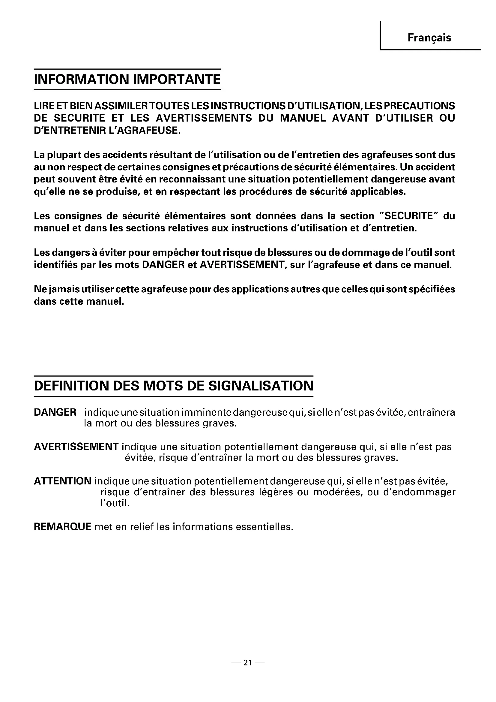 INFORMATION IMPORTANTE LIRE ET BIEN ASSIMILER TOUTES LES INSTRUCTIONS D’UTILISATION, LES PRECAUTIONS DE SECURITE ET LES AVERTISSEMENTS DU MANUEL AVANT D’UTILISER OU D’ENTRETENIR L’AGRAFEUSE. La plupart des accidents résultant de l’utilisation ou de l’entretien des agrafeuses sont dus au non respect de certaines consignes et précautions de sécurité élémentaires. Un accident peut souvent être évité en reconnaissant une situation potentiellement dangereuse avant qu’elle ne se produise, et en respectant les procédures de sécurité applicables. Les consignes de sécurité élémentaires sont données dans la section “SECURITE” du manuel et dans les sections relatives aux instructions d’utilisation et d’entretien. Les dangers à éviter pour empêcher tout risque de blessures ou de dommage de l’outil sont identifiés par les mots DANGER et AVERTISSEMENT, sur l’agrafeuse et dans ce manuel. Ne jamais utiliser cette agrafeuse pour des applications autres que celles qui sont spécifiées dans cette manuel.