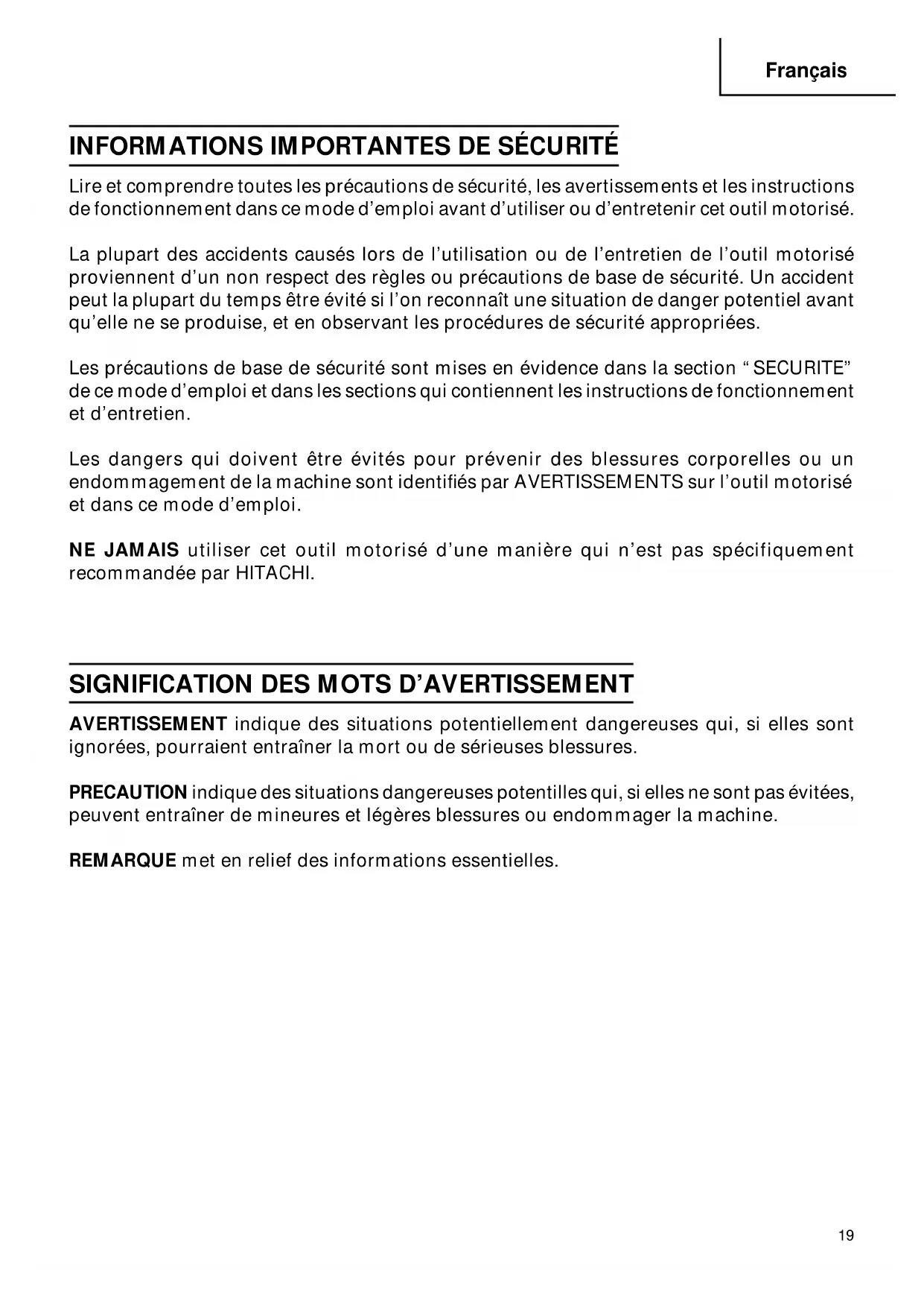 Lire et comprendre toutes les précautions de sécurité, les avertissements et les instructions de fonctionnement dans ce mode d’emploi avant d’utiliser ou d’entretenir cet outil motorisé. La plupart des accidents causés lors de l’utilisation ou de l’entretien de l’outil motorisé proviennent d’un non respect des règles ou précautions de base de sécurité. Un accident peut la plupart du temps être évité si l’on reconnaît une situation de danger potentiel avant qu’elle ne se produise, et en observant les procédures de sécurité appropriées. Les précautions de base de sécurité sont mises en évidence dans la section “SECURITE” de ce mode d’emploi et dans les sections qui contiennent les instructions de fonctionnement et d’entretien. Les dangers qui doivent être évités pour prévenir des blessures corporelles ou un endommagement de la machine sont identifiés par AVERTISSEMENTS sur l’outil motorisé et dans ce mode d’emploi. NE JAMAIS utiliser cet outil motorisé d’une manière qui n’est pas spécifiquement recommandée par HITACHI.