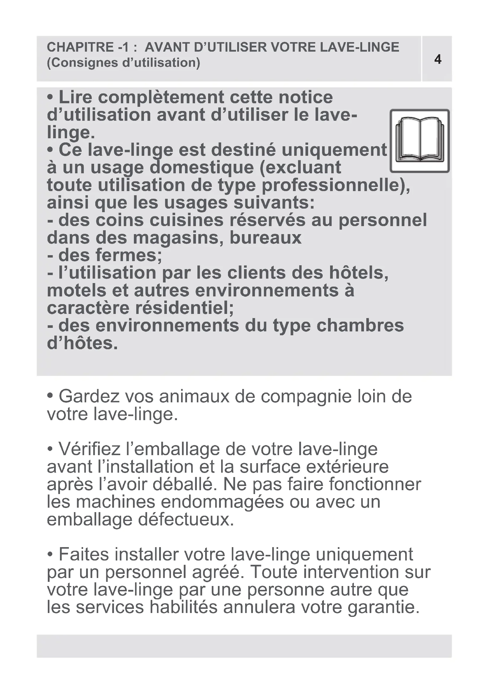 - Ce lave-linge est destiné uniquement à un usage domestique (excluant toute utilisation de type professionnelle), ainsi que les usages suivants: - des coins cuisines réservés au personnel dans des magasins, bureaux - des fermes; - l’utilisation par les clients des hôtels, motels et autres environnements à caractère résidentiel; - des environnements du type chambres d’hôtes.