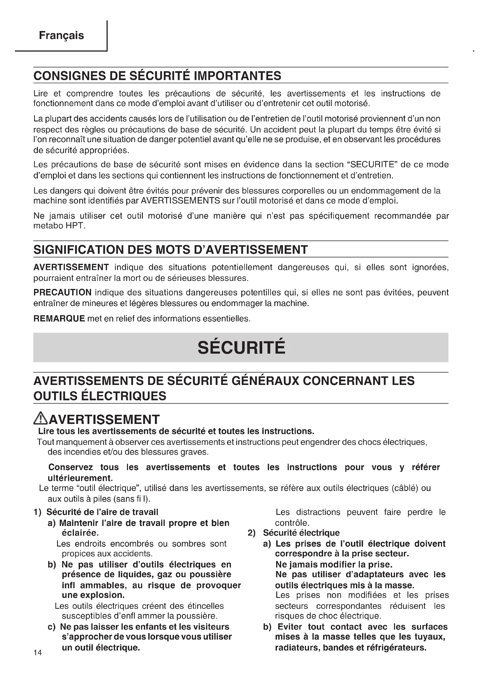 Ne jamais utiliser cet outil motorisé d'une manière qui n'est pas spécifiquement recommandée par metabo HPT.