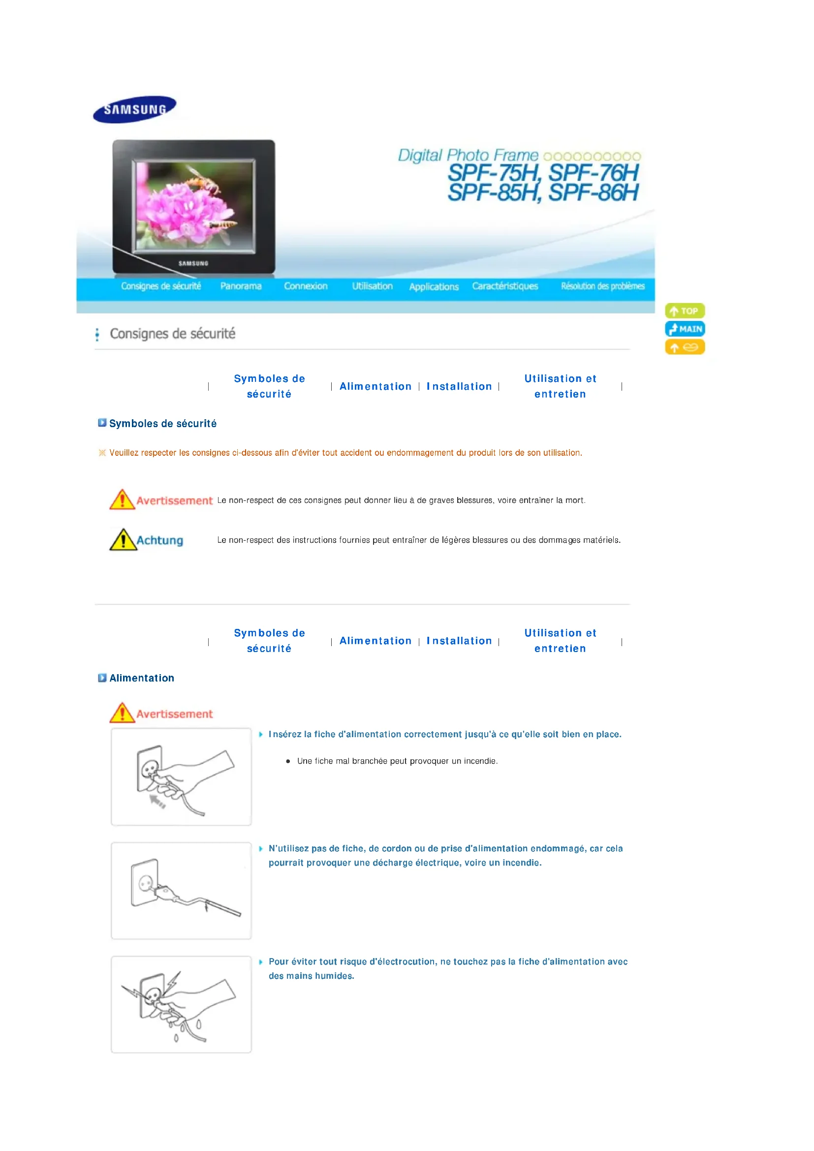 Pour éviter tout risque d'électrocution, ne touchez pas la fiche d'alimentation avec des mains humides.Ne branchez pas plusieurs appareils sur une seule prise, car sa surchauffe pourrait provoquer un incendie.