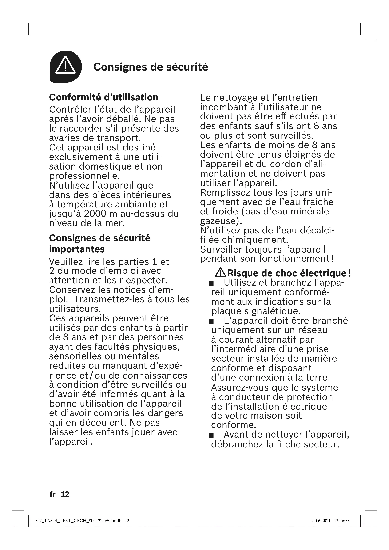 Le nettoyage et l’entretien incombant à l’utilisateur ne doivent pas être e ectués par des enfants sauf s’ils ont 8 ans ou plus et sont surveillés. Les enfants de moins de 8 ans doivent être tenus éloignés de l’appareil et du cordon d’ali- mentation et ne doivent pas utiliser l’appareil. Remplissez tous les jours uni- quement avec de l’eau fraiche et froide (pas d’eau minérale gazeuse). N’utilisez pas de l’eau décalci- ée chimiquement. Surveiller toujours l’appareil pendant son fonctionnement ! W Risque de choc électrique ! ■ Utilisez et branchez l’appa- reil uniquement conformé- ment aux indications sur la plaque signalétique. ■ L’appareil doit être branché uniquement sur un réseau à courant alternatif par l’intermédiaire d’une prise secteur installée de manière conforme et disposant d’une connexion à la terre. Assurez-vous quelesystème àconducteur deprotection del’installation électrique de votre maison soit conforme. ■ Avant de nettoyer l’appareil, débranchez la che secteur. Conformité d’utilisation Contrôler l’état de l’appareil après l’avoir déballé. Ne pas le raccorder s’il présente des avaries de transport. Cet appareil est destiné exclusivement à une utili- sation domestique et non professionnelle. N’utilisez l’appareil que dans des pièces intérieures à température ambiante et jusqu’à 2000m au-dessus du niveaude la mer. Consignes de sécurité importantes Veuillez lire les parties1 et 2 du mode d’emploi avec attention et les r especter. Conservez les notices d’em- ploi. Transmettez-les à tous les utilisateurs. Ces appareils peuvent être utilisés par des enfants à partir de 8 ans et par des personnes ayant des facultés physiques, sensorielles ou mentales réduites ou manquant d’expé- rience et / ou de connaissances à condition d’être surveillés ou d’avoir été informés quant à la bonne utilisation de l’appareil et d’avoir compris les dangers qui en découlent. Ne pas laisser les enfants jouer avec l’appareil. C7_TAS14_TEXT_GBCH_8001224659.indb 12C7_TAS14_TEXT_GBCH_8001224659.indb 12 21.06.2021 12:46:5821.06.2021 12:46:5813