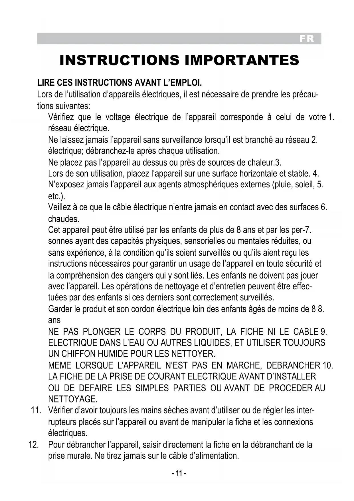 INSTRUCTIONS IMPORTANTES LIRE CES INSTRUCTIONS AVANT L’EMPLOI. Lors de l’utilisation d’appareils électriques, il est nécessaire de prendre les précau- tions suivantes: Vérifiez que le voltage électrique de l’appareil corresponde à celui de votre 1. réseau électrique. Ne laissez jamais l’appareil sans surveillance lorsqu’il est branché au réseau 2. électrique; débranchez-le après chaque utilisation. Ne placez pas l’appareil au dessus ou près de sources de chaleur.3. Lors de son utilisation, placez l’appareil sur une surface horizontale et stable. 4. N’exposez jamais l’appareil aux agents atmosphériques externes (pluie, soleil, 5. etc.). Veillez à ce que le câble électrique n’entre jamais en contact avec des surfaces 6. chaudes. Cet appareil peut être utilisé par les enfants de plus de 8 ans et par les per-7. sonnes ayant des capacités physiques, sensorielles ou mentales réduites, ou sans expérience, à la condition qu’ils soient surveillés ou qu’ils aient reçu les instructions nécessaires pour garantir un usage de l’appareil en toute sécurité et la compréhension des dangers qui y sont liés. Les enfants ne doivent pas jouer avec l’appareil. Les opérations de nettoyage et d’entretien peuvent être effec- tuées par des enfants si ces derniers sont correctement surveillés. Garder le produit et son cordon électrique loin des enfants âgés de moins de 8 8. ans NE PAS PLONGER LE CORPS DU PRODUIT, LA FICHE NI LE CABLE 9. ELECTRIQUE DANS L’EAU OU AUTRES LIQUIDES, ET UTILISER TOUJOURS UN CHIFFON HUMIDE POUR LES NETTOYER. MEME LORSQUE L’APPAREIL N’EST PAS EN MARCHE, DEBRANCHER 10. LA FICHE DE LA PRISE DE COURANT ELECTRIQUE AVANT D’INSTALLER OU DE DEFAIRE LES SIMPLES PARTIES OU AVANT DE PROCEDER AU NETTOYAGE. Vérifier d’avoir toujours les mains sèches avant d’utiliser ou de régler les inter-11. rupteurs placés sur l’appareil ou avant de manipuler la fiche et les connexions électriques. Pour débrancher l’appareil, saisir directement la fiche en la débranchant de la 12. prise murale. Ne tirez jamais sur le câble d’alimentation.FR