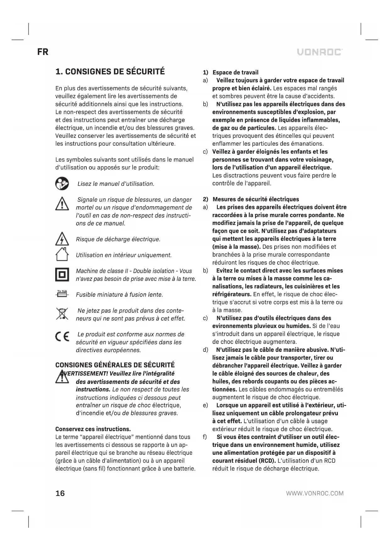 ENVIRONNEMENT Les équipements électroniques ou électriques défectueux ou destinés à être mis au rebut doivent être déposés aux points de recyclage appropriés. Uniquement pour les pays de l’UE Ne jetez pas les outils électriques avec les déchets domestiques. Selon la Directive européenne 2012/19/CE relative aux déchets d’équipements électriques et électroniques et sa mise en oeuvre dans le droit national, les outils électriques hors d’usage doivent être collectés séparément et mis au rebut de manière écologique. GARANTIE Les produits VONROC sont développés aux plus hauts standards de qualité et ils sont garantis contre les défauts de pièces et de main d’oeuvre pendant la durée légale stipulée à partir de la date d’achat d’origine du produit. En cas d’une quelconque panne du produit pendant cette durée qui serait due à un défaut matériel et/ou de main d’oeuvre, contactez directement VONROC. Les circonstances suivantes ne sont pas prises en charge par la garantie: