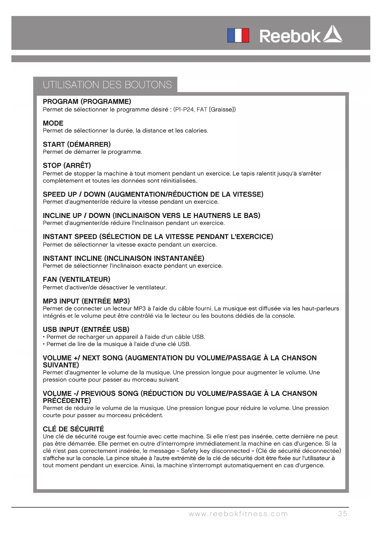 appuyant sur le bouton d'augmentation/de réduction avant d'utiliser le bouton START (DÉMARRER).www.reebokfitness.com 37.