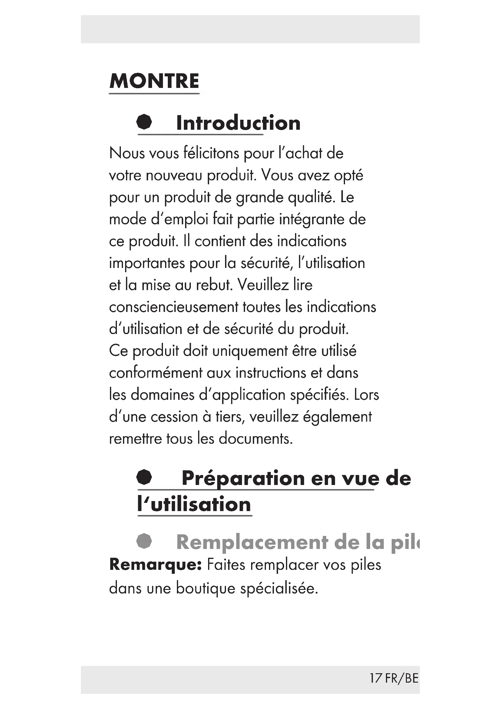 dans le sens contraire des aiguilles d‘une montre pour marquer le début d‘une mesure de temps. § Nettoyage et entretien Nettoyez uniquement l’extérieur du produit, à l’aide d’un chiffon doux sec.20 FR/BE § Recyclage L’emballage se compose de matières recyclables qui peuvent être mises au rebut dans les déchetteries locales. Les possibilités de recyclage des produits usés sont à demander auprès de votre municipalité. Pour le respect de l‘environnement, lorsque vous n‘utilisez plus votre produit, ne le jetez pas avec les ordures ménagères, mais entreprenez un recyclage adapté. Pour obtenir des renseignements et des horaires d‘ouverture concernant les points de collecte, vous pouvez contacter votre administration locale. Les piles défectueuses ou usagées doivent être recyclées conformément à la directive 2006 / 66 / CE et ses modifications. Les piles et / ou l‘appareil doivent être retournés dans les centres de collecte.21 FR/BE Pollution de l’environnement par mise au rebut incorrecte des piles ! Les piles ne doivent pas être mises au rebut dans les ordures ménagères. Elles peuvent contenir des métaux lourds toxiques et doivent être considérés comme des déchets spéciaux. Les symboles chimiques des métaux lourds sont les suivants : Cd = cadmium, Hg= mercure, Pb = plomb. Pour cette raison, veuillez toujours déposer les piles usées dans les conteneurs de recyclage communaux. § Garantie L’appareil a été fabriqué selon des critères de qualité stricts et contrôlé consciencieusement avant sa livraison. En cas de défaillance, vous êtes en droit de retourner ce produit au vendeur. La présente garantie ne constitue pas une restriction de vos droits légaux.22 FR/BE Cet appareil bénéficie d‘une garantie de 3 ans à compter de sa date d’achat. La durée de garantie débute à la date d’achat. Veuillez conserver le ticket de caisse original. Il fera office de preuve d’achat. Si un problème matériel ou de fabrication devait survenir dans 3 ans suivant la date d‘achat de ce produit, nous assurons à notre discrétion la réparation ou le remplacement de l‘appareil sans frais supplémentaires. La garantie prend fin si le produit est endommagé suite à une utilisation inappropriée ou à un entretien défaillant. La garantie couvre les vices matériels et de fabrication. Cette garantie ne s’étend pas aux pièces du produit soumises à une usure normale (p. ex. des batteries) et qui, par conséquent, peuvent être considérées comme des pièces d’usure, ni aux dommages sur des composants fragiles, comme des interrupteurs, des batteries et des éléments fabriqués en verre.23 FR/BE La garantie ne couvre pas non plus la perte de l’étanchéité à l’eau. L’état d’étanchéité à l’eau n’est pas une propriété durable et fait l’objet d’une maintenance périodique. Veuillez noter que votre garantie devient caduque pour les cas suivants: ouverture et la réparation de votre montre par des personnes non autorisées.24 NL/BE HORLOGE § Inleiding Hartelijk gefeliciteerd met de aankoop van uw nieuwe product. U heeft voor een hoogwaardig product gekozen. De gebruiksaanwijzing is een deel van het product. Deze bevat belangrijke aanwijzingen voor veiligheid, gebruik en verwijdering. Maakt U zich voor de ingebruikname van het product met alle bedienings- en veiligheidsvoorschriften vertrouwd. Gebruik het apparaat alleen zoals beschreven en voor de aangegeven toepassingsgebieden. Overhandig alle documenten bij doorgifte van het product aan derden. § Ingebruikneming § De batterij vervangen Opmerking: Laat de batterijen vervangen in een speciaalzaak.25 NL/BE § Display