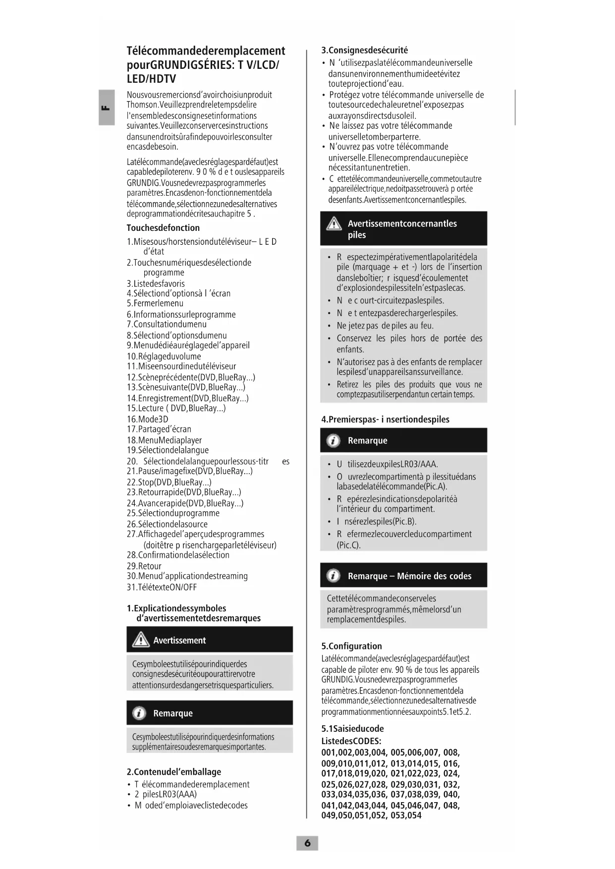 Télécommande de remplacement pour GRUNDIG SÉRIES :TV/LCD/ LED/HDTV Nous vous remercions d’avoir choisi un produit Thomson. Veuillez prendre le temps de lire l'ensemble des consignes et informations suivantes. Veuillez conserver ces instructions dans un endroit sûr afin de pouvoir les consulter en cas de besoin. La télécommande (avec les réglages par défaut) est capable de piloter env.90%detous les appareils GRUNDIG. Vous ne devrez pas programmer les paramètres. En cas de non-fonctionnement de la télécommande, sélectionnez une des alternatives de programmation décrites au chapitre5. Touches de fonction