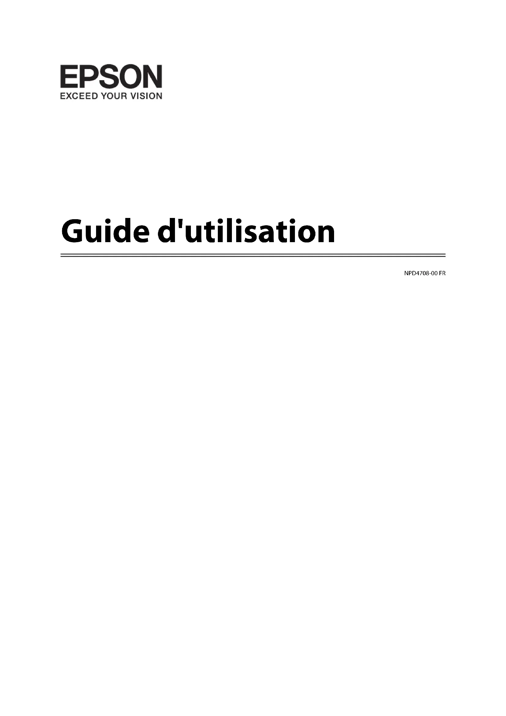 Guide d'utilisation NPD4708-00 FRDroits d’auteur et marques Droits d’auteur et marques Aucune partie de ce manuel ne peut être reproduite, stockée dans un système documentaire ou transmise sous quelque forme ou de quelque manière que ce soit, électronique, mécanique, par photocopie, enregistrement ou autre, sans l’accord préalable écrit de Seiko Epson Corporation. L’utilisation des informations du présent manuel n’accorde aucune responsabilité en matière de brevets. Il en va de même pour les dommages résultant de l’utilisation des informations du présent manuel. Les informations contenues dans la présente notice sont exclusivement destinées à l’utilisation de ce produit Epson. Epson ne pourra être tenue responsable de l’utilisation de ces informations avec d’autres produits. Ni Seiko Epson Corporation ni ses filiales ne pourront être tenues responsables envers l’acquéreur de ce produit ou envers des tiers, des dommages, pertes, frais ou dépenses encourus par l’acquéreur ou les tiers à la suite des événements suivants : accident, utilisation incorrecte ou abusive de ce produit, modifications, réparations ou altérations illicites de ce produit ou (sauf aux États-Unis) non-respect au sens strict des consignes d’utilisation et de maintenance de Seiko Epson Corporation. Seiko Epson Corporation et ses filiales ne pourront être tenues responsables des dommages ou problèmes survenus par suite de l’utilisation de produits optionnels ou consommables autres que ceux désignés par Seiko Epson Corporation comme étant des Produits d’origine Epson ou des Produits approuvés par Epson. Seiko Epson Corporation ne pourra être tenue responsable des dommages résultant des interférences électromagnétiques se produisant à la suite de l’utilisation de câbles d’interface autres que ceux désignés par Seiko Epson Corporation comme étant des Produits approuvés par Epson. EPSON
