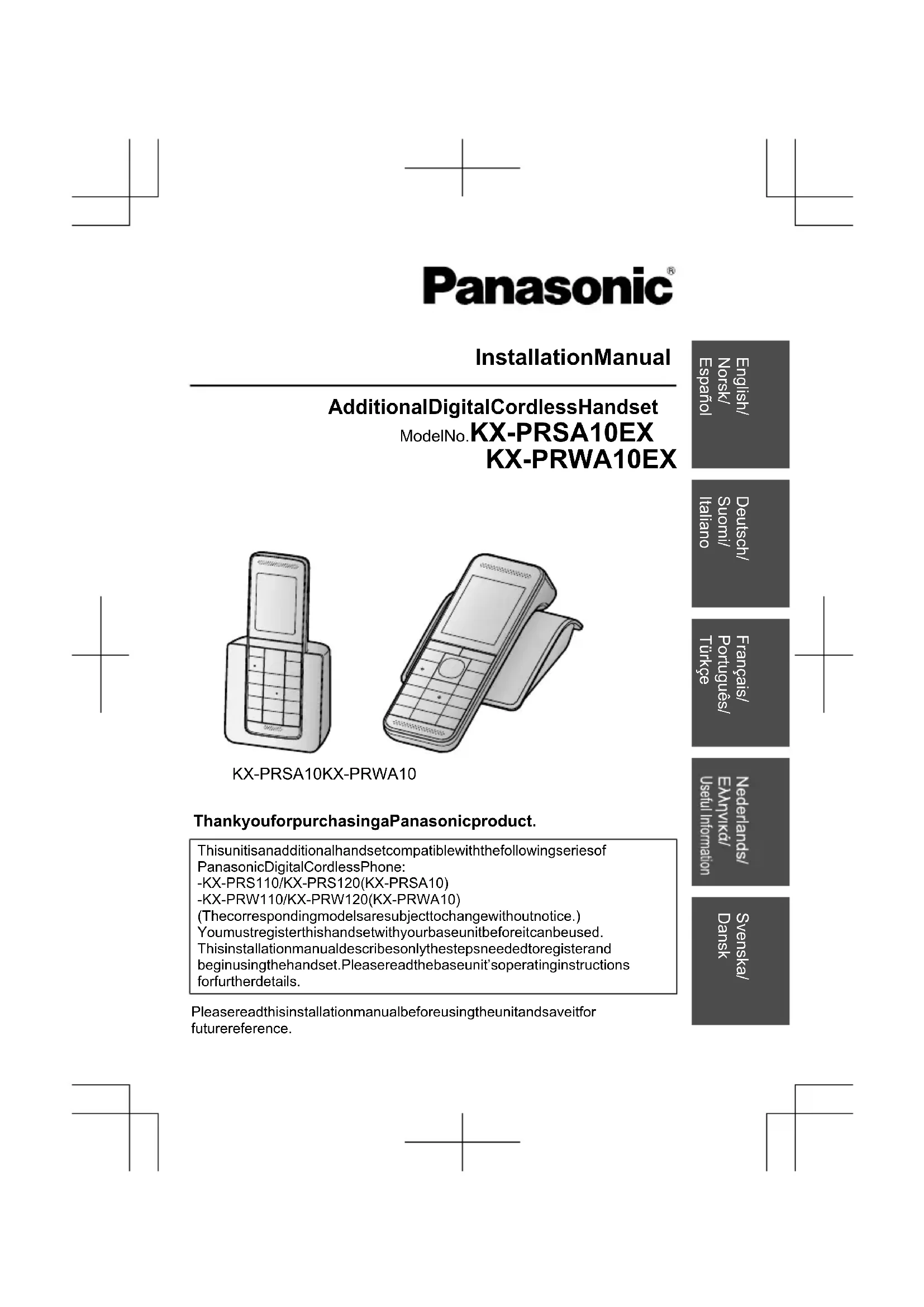 Installation PRSA_PRWA10EX(de)_0509_ver011.pdf 8 2013/05/09 10:49:41Manuel d’installation Combiné supplémentaire numérique sans fil Modèle KX-PRSA10EX KX-PRWA10EX KX-PRSA10 KX-PRWA10 Vous venez d’acquérir un produit Panasonic et nous vous en remercions. Cet appareil est un combiné supplémentaire compatible avec les séries de téléphones numériques sans fil Panasonic suivantes : - KX-PRS110/KX-PRS120 (KX-PRSA10) - KX-PRW110/KX-PRW120 (KX-PRWA10) (Les modèles correspondants peuvent être modifiés sans préavis.) Vous devez enregistrer ce combiné sur la base avant de pouvoir l’utiliser. Ce manuel d’installation n’explique que la procédure requise pour enregistrer le combiné et com- mencer à l’utiliser. Pour plus de détails, reportez-vous au Manuel utilisateur de la base. Veuillez lire le présent manuel d’installation avant d’utiliser l’appareil et conservez-le pour référence ultérieure. PRSA_PRWA10EX(fr)_0509_ver011.pdf 1 2013/05/09 11:01:06Informations sur les accessoires Accessoires fournis Accessoire/Référence Quantité Chargeur 1 Adaptateur secteur/PNLV233CE 1 Batteries rechargeables