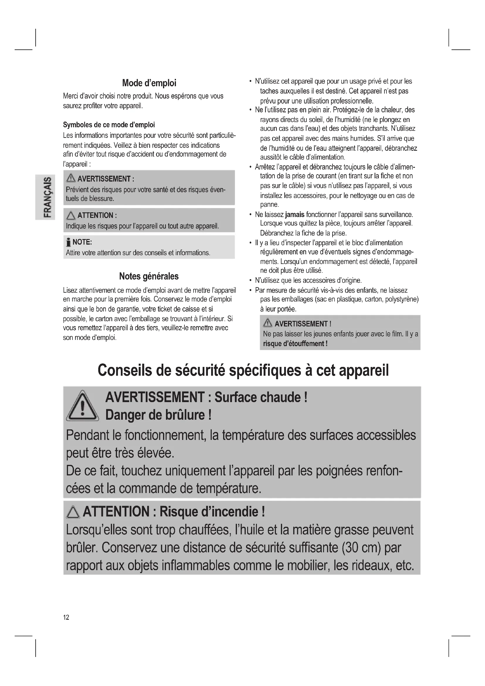 Prévient des risques pour votre santé et des risques éven- tuels de blessure. ATTENTION : Indique les risques pour l’appareil ou tout autre appareil. NOTE: Attire votre attention sur des conseils et informations. Notes générales Lisez attentivement ce mode d’emploi avant de mettre l’appareil en marche pour la première fois. Conservez le mode d’emploi ainsi que le bon de garantie, votre ticket de caisse et si possible, le carton avec l’emballage se trouvant à l’intérieur. Si vous remettez l‘appareil à des tiers, veuillez-le remettre avec son mode d‘emploi. Conseils de sécurité spéciques à cet appareil