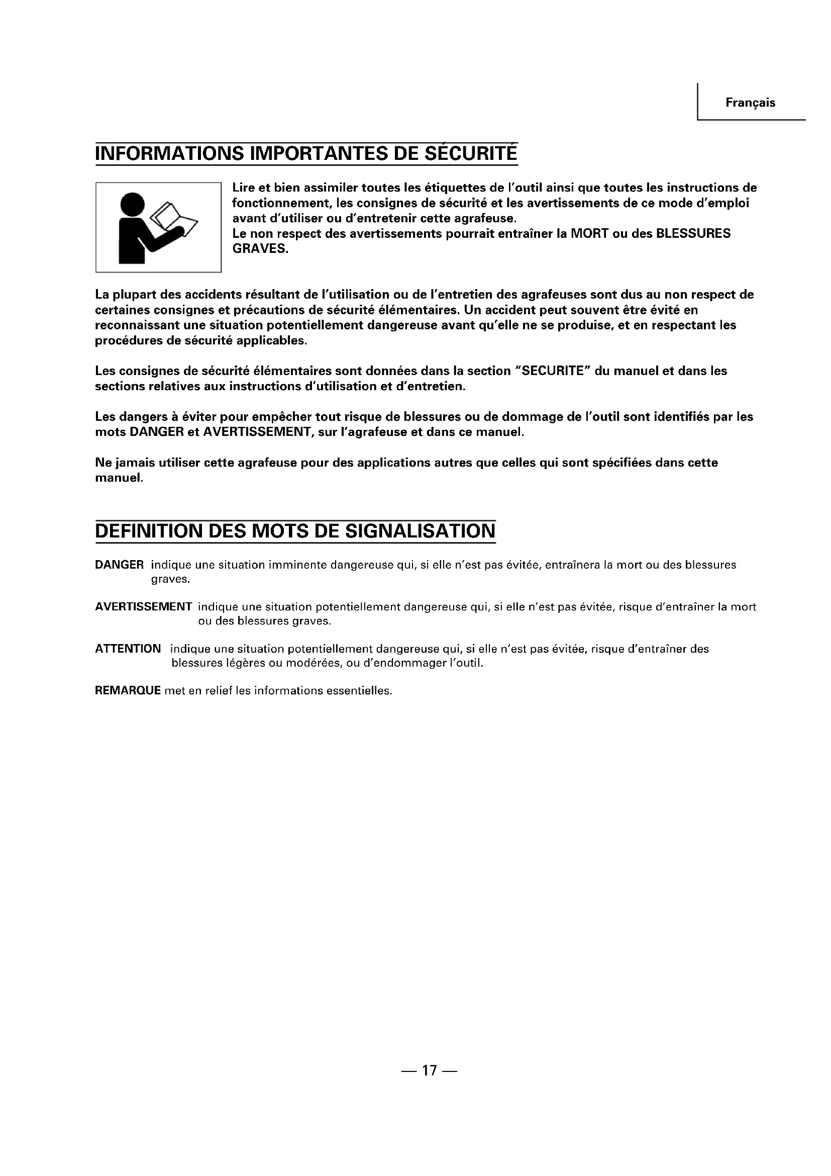 Lire et bien assimiler toutes les étiquettes de l’outil ainsi que toutes les instructions de fonctionnement, les consignes de sécurité et les avertissements de ce mode d’emploi avant d’utiliser ou d’entretenir cette agrafeuse. Le non respect des avertissements pourrait entraîner la MORT ou des BLESSURES GRAVES. La plupart des accidents résultant de l’utilisation ou de l’entretien des agrafeuses sont dus au non respect de certaines consignes et précautions de sécurité élémentaires. Un accident peut souvent être évité en reconnaissant une situation potentiellement dangereuse avant qu’elle ne se produise, et en respectant les procédures de sécurité applicables. Les consignes de sécurité élémentaires sont données dans la section “SECURITE” du manuel et dans les sections relatives aux instructions d’utilisation et d’entretien. Les dangers à éviter pour empêcher tout risque de blessures ou de dommage de l’outil sont identifiés par les mots DANGER et AVERTISSEMENT, sur l’agrafeuse et dans ce manuel. Ne jamais utiliser cette agrafeuse pour des applications autres que celles qui sont spécifiées dans cette manuel.