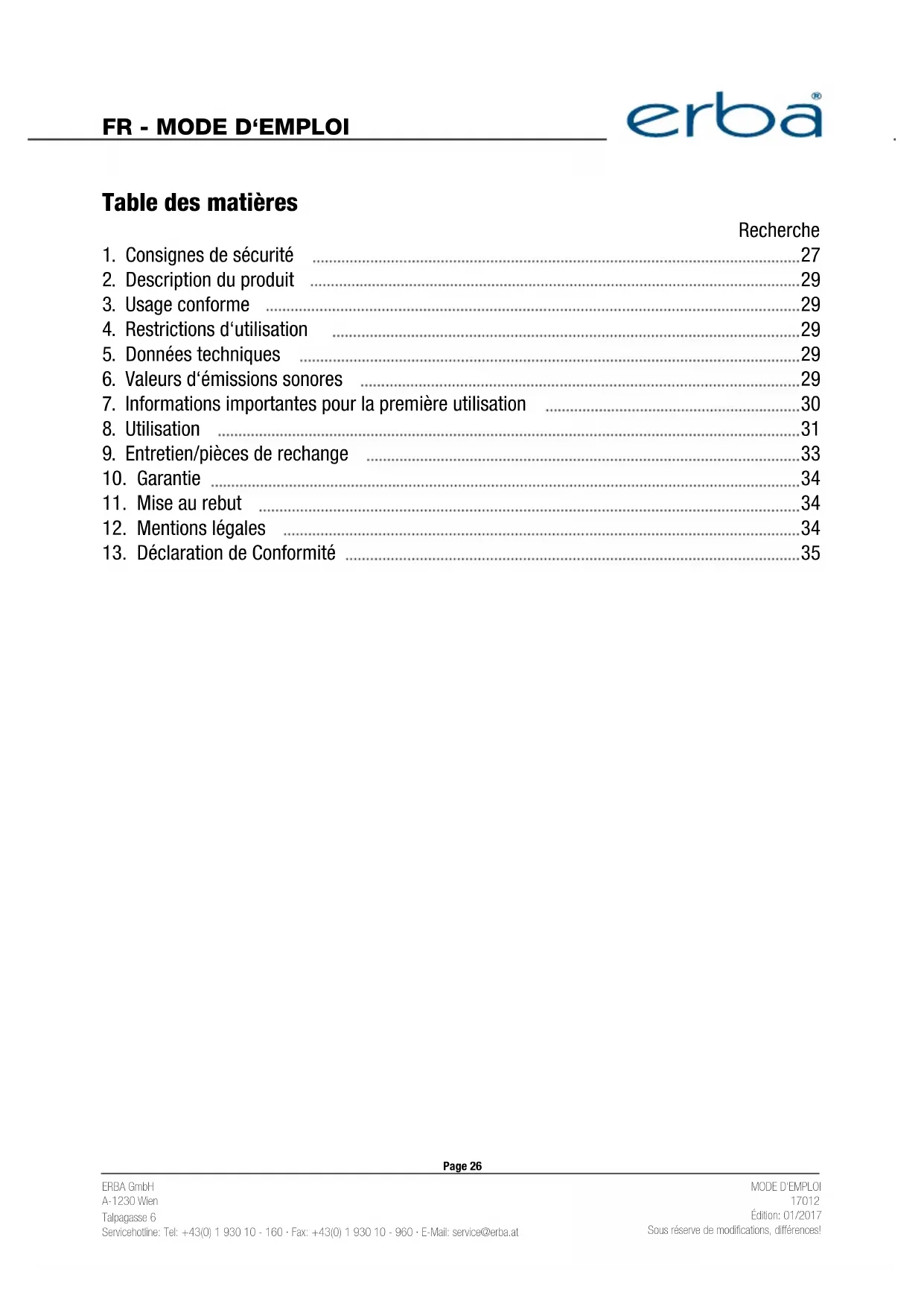 Tous droits réservés. Ce mode d'emploi est protégé par copyright. La reproduction sous toutes ses formes (imprimée, numérique etc.) est strictement interdite sans l'autorisation écrite d'ERBA GmbH.