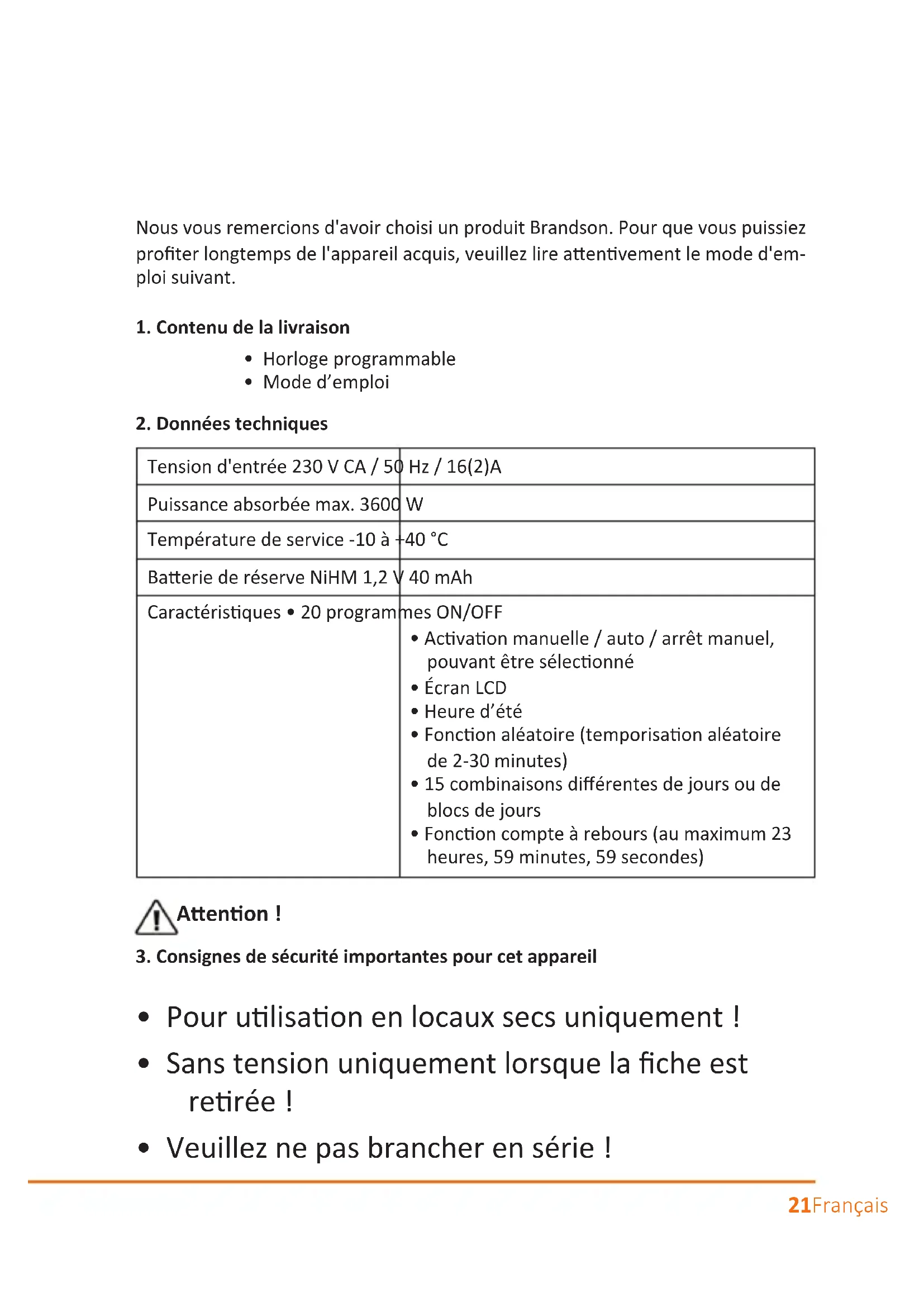 Nous vous remercions d'avoir acheté un produit Brandonson. Pour que vous puissiez profiter longtemps de l'appareil acquis, veuillez lire attentivement le mode d'emploi suivant.