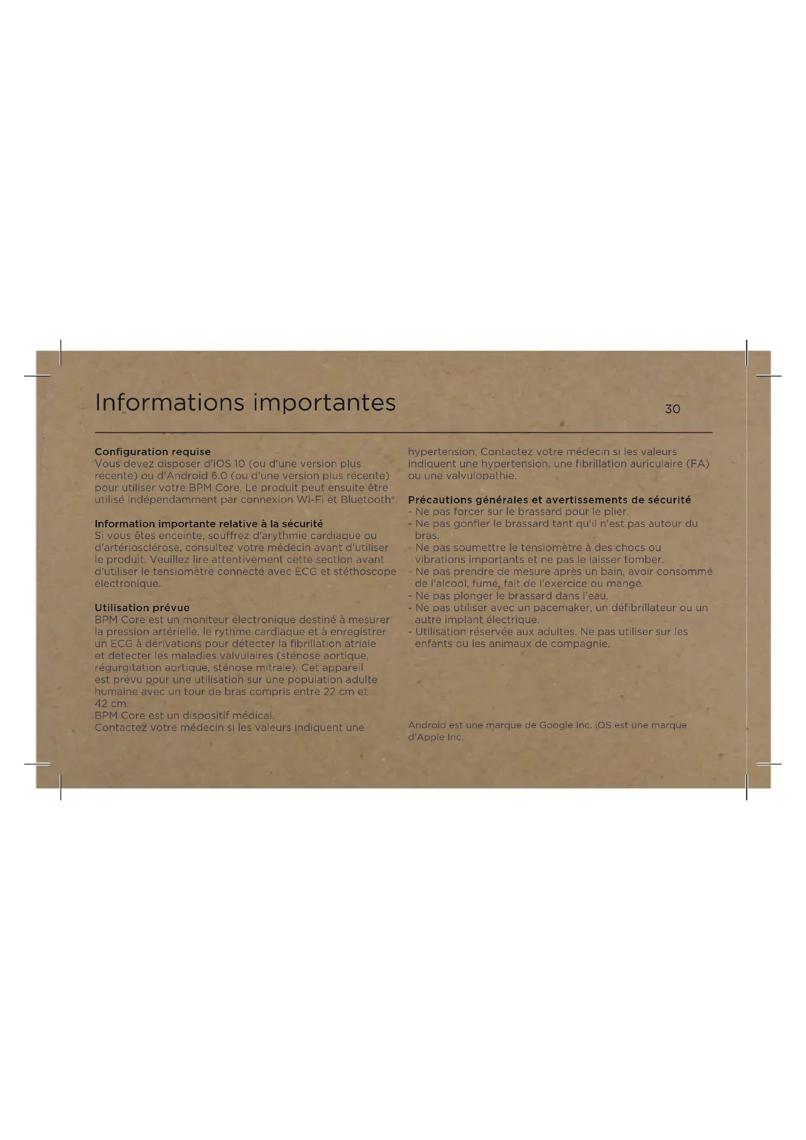 -5 % UT(95% dip in UT) for 0.5 cycle, -40 % UT (60 % dip in UT) for 5 cycles, -70 % UT(30 % dip in UT) for 25 cycles, -5 % UT (95 % dip in UT) for 5 sec N/A Mains power quality should be that of a typical commercial or hospital environment. If the user of the EQUIPMENT or SYSTEM requires continued operation during power mains interruptions, it is recommended that the EQUIPMENT or SYSTEM be powered from an uninterruptible power supply or a battery. Power frequency (50/60 Hz) magnetic field IEC 61000-4-8 30 A/m 50 Hz or 60 Hz 30 A/m 50 Hz and 60 Hz Power frequency magnetic fields should be at levels characteristic of a typical location in a typical commercial or hospital environment. 28 – 29 Declaration – electromagnetic emissions and immunity for equipment and systems that are not life-supporting and are specified for use only in a shielded location30 Configuration requise Vous devez disposer d'iOS 10 (ou d'une version plus récente) ou d'Android 6.0 (ou d'une version plus récente) pour utiliser votre BPM Core. Le produit peut ensuite être utilisé indépendamment par connexion Wi-Fi et Bluetooth®. Information importante relative à la sécurité Si vous êtes enceinte, sourez d'arythmie cardiaque ou d'artériosclérose, consultez votre médecin avant d'utiliser le produit. Veuillez lire attentivement cette section avant d'utiliser le tensiomètre connecté avec ECG et stéthoscope électronique. Utilisation prévue BPM Core est un moniteur électronique destiné à mesurer la pression artérielle, le rythme cardiaque et à enregistrer un ECG à dérivations pour détecter la fibrillation atriale et détecter les maladies valvulaires (sténose aortique, régurgitation aortique, sténose mitrale). Cet appareil est prévu pour une utilisation sur une population adulte humaine avec un tour de bras compris entre 22 cm et 42cm. BPM Core est un dispositif médical. Contactez votre médecin si les valeurs indiquent une hypertension. Contactez votre médecin si les valeurs indiquent une hypertension, une fibrillation auriculaire (FA) ou une valvulopathie. Précautions générales et avertissements de sécurité - Ne pas forcer sur le brassard pour le plier. - Ne pas gonfler le brassard tant qu'il n'est pas autour du bras. - Ne pas soumettre le tensiomètre à des chocs ou vibrations importants et ne pas le laisser tomber. - Ne pas prendre de mesure après un bain, avoir consommé de l'alcool, fumé, fait de l'exercice ou mangé. - Ne pas plonger le brassard dans l'eau. - Ne pas utiliser avec un pacemaker, un défibrillateur ou un autre implant électrique. - Utilisation réservée aux adultes. Ne pas utiliser sur les enfants ou les animaux de compagnie. Informations importantes Android est une marque de Google Inc. iOS est une marque d'Apple Inc.31 Utilisation générale Consultez toujours votre médecin. Il est dangereux de s'auto-diagnostiquer et de s'auto-traiter à partir des résultats des mesures. Les personnes sourant de graves problèmes de la circulation ou de troubles sanguins doivent consulter un médecin avant d'utiliser le tensiomètre. Le gonflage du brassard peut provoquer une hémorragie interne. Les facteurs opérationnels tels que les arythmies communes, les extrasystoles ventriculaires, la sclérose artérielle, une mauvaise vascularisation, le diabète, l'âge, la grossesse, une pré-éclampsie ou une maladie rénale peuvent aecter le fonctionnement du sphygmomanomètre automatisé et/ou de sa mesure de la pression artérielle. Ce dispositif est un équipement de mesure de précision dont l'utilisation est à la portée des utilisateurs non professionnels, mais qui doit être manipulé avec précaution. Une exposition prolongée du dispositif aux peluches, à la poussière ou à la lumière du soleil peut réduire sa durée de vie ou l'endommager. Un brassard ou un capteur endommagés peuvent entraîner des mesures incorrectes. Le port USB ne doit pas être utilisé. L'utilisateur est un opérateur désigné. Parties en contact avec la peau: brassard et électrodes. Les températures extrêmes, l'humidité et l'altitude peuvent aecter les mesures. - Ne pas laisser le tensiomètre sans surveillance à la portée de jeunes enfants ou de personnes incapables d'exprimer leur consentement. - Ne pas utiliser le tensiomètre à d'autres fins que la mesure de la pression artérielle. - Ne pas démonter le tensiomètre. - Ne pas utiliser le tensiomètre dans un véhicule en mouvement (voiture, avion). - Ne pas utiliser de téléphone cellulaire à proximité de l'appareil. - Ne pas utiliser l'appareil avec le câble USB branché. - Une pression continue incorrecte du brassard ou des mesures trop fréquentes peuvent entraver la circulation sanguine et entraîner des lésions graves pour les utilisateurs. Vérifiez si l'utilisation du dispositif n'entraîne pas une insusance veineuse durable. - N'appliquez pas le brassard sur un bras blessé ou faisant l'objet d'un traitement médical, sous peine d'aggraver la blessure. - En cas de mastectomie, le brassard doit être utilisé sur le bras du côté où elle a été pratiquée. - L'utilisation du dispositif sur un membre déjà porteur d'un équipement peut entraîner un dysfonctionnement temporaire de cet équipement. Mise en garde32 Nettoyage - Ne pas utiliser d'agent à base d'alcool ou de solvant pour nettoyer le dispositif - Nettoyez l'appareil à l'aide d'un chion doux et sec - La saleté sur le brassard peut être nettoyée à l'aide d'un chion humide et de savon - Le dispositif et le brassard ne doivent pas être rincés à l'eau abondante - Le dispositif ne doit pas être démonté. Ne pas tenter de débrancher le brassard ni de le réparer soi-même. En cas de problème, contacter le distributeur - Ne pas utiliser le dispositif dans un environnement impliquant des températures ou une humidité extrêmes, ni à la lumière directe du soleil - Le dispositif ne doit pas être secoué violemment - Ne pas plonger l'appareil ni