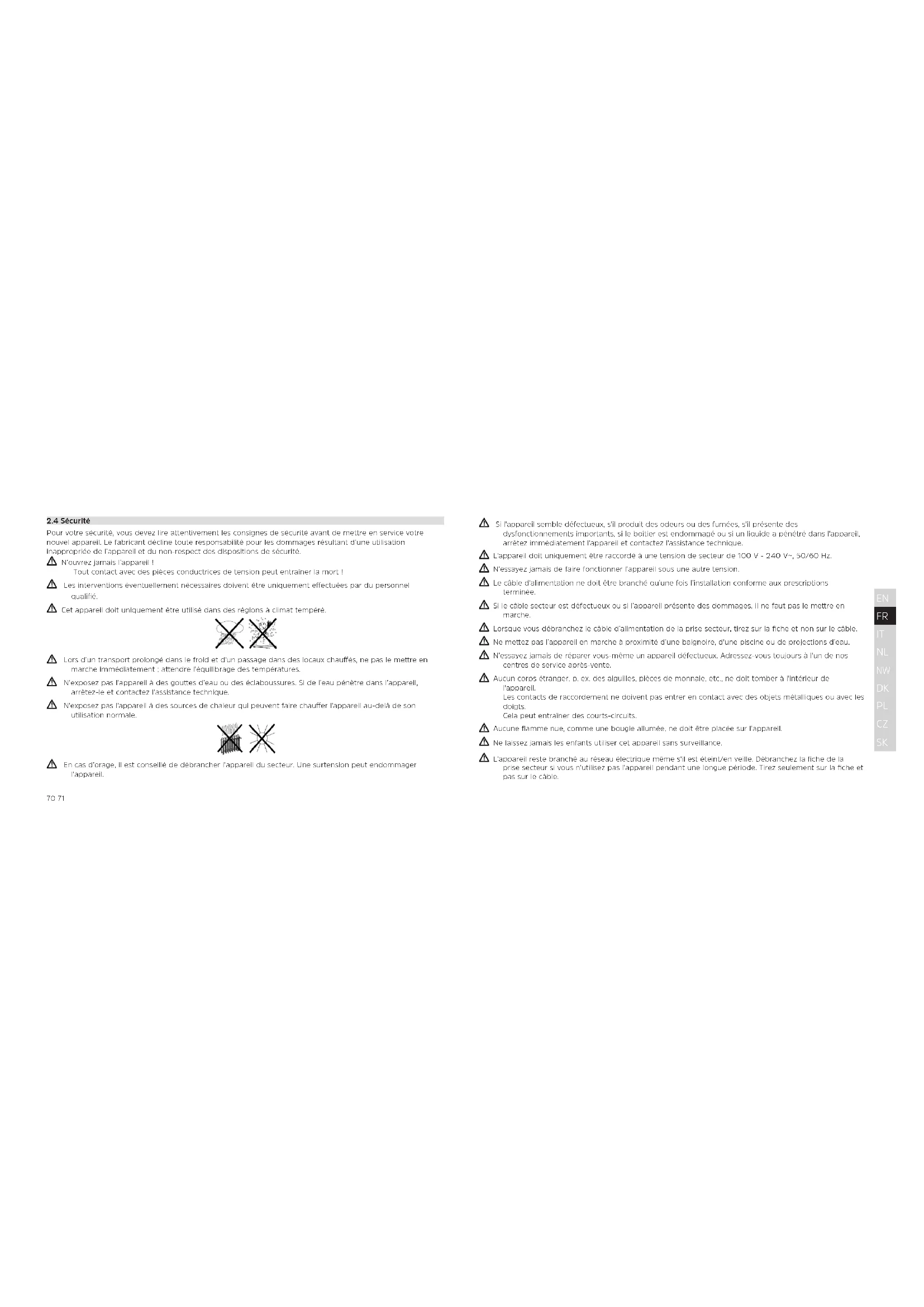 Pour votre sécurité, vous devez lire attentivement les consignes de sécurité avant de mettre en service votre nouvel appareil. Le fabricant décline toute responsabilité pour les dommages résultant d’une utilisation inappropriée de l’appareil et du non-respect des dispositions de sécurité. N’ouvrez jamais l’appareil! Tout contact avec des pièces conductrices de tension peut entraîner la mort! Les interventions éventuellement nécessaires doivent être uniquement eectuées par du personnel qualifié. Cet appareil doit uniquement être utilisé dans des régions à climat tempéré. Lors d’un transport prolongé dans le froid et d'un passage dans des locaux chaués, ne pas le mere en marche immédiatement; aendre l’équilibrage des températures. N’exposez pas l’appareil à des goues d’eau ou des éclaboussures. Si de l’eau pénètre dans l’appareil, arrêtez-le et contactez l’assistance technique. N'exposez pas l'appareil à des sources de chaleur qui peuvent faire chauer l'appareil au-delà de son utilisation normale. En cas d’orage, il est conseillé de débrancher l’appareil du secteur. Une surtension peut endommager l’appareil. BDA_DIGITRADIO_600_630.indd 70-71 22/06/2018 09:3172 73