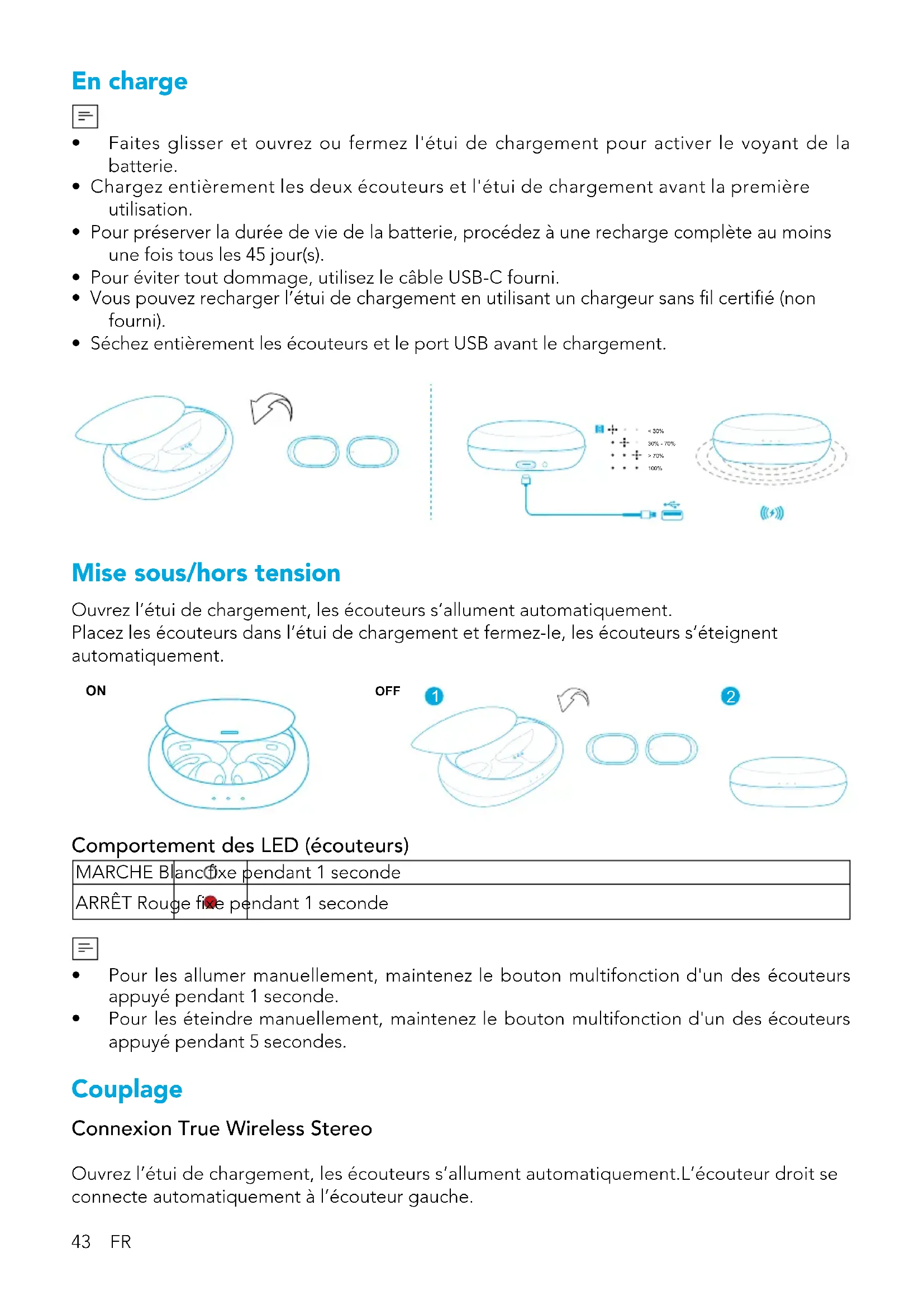 - Pour les éteindre manuellement, maintenez le bouton multifonction d'un des écouteurs appuyé pendant 5 secondes. Couplage Connexion True Wireless Stereo Ouvrez l’étui de chargement, les écouteurs s’allument automatiquement.L’écouteur droit se connecte automatiquement à l’écouteur gauche.FR 44 Comportement des LED (écouteurs) Blanc intermittent Connexion TWS Blanc xe pendant 1 seconde TWS connecté