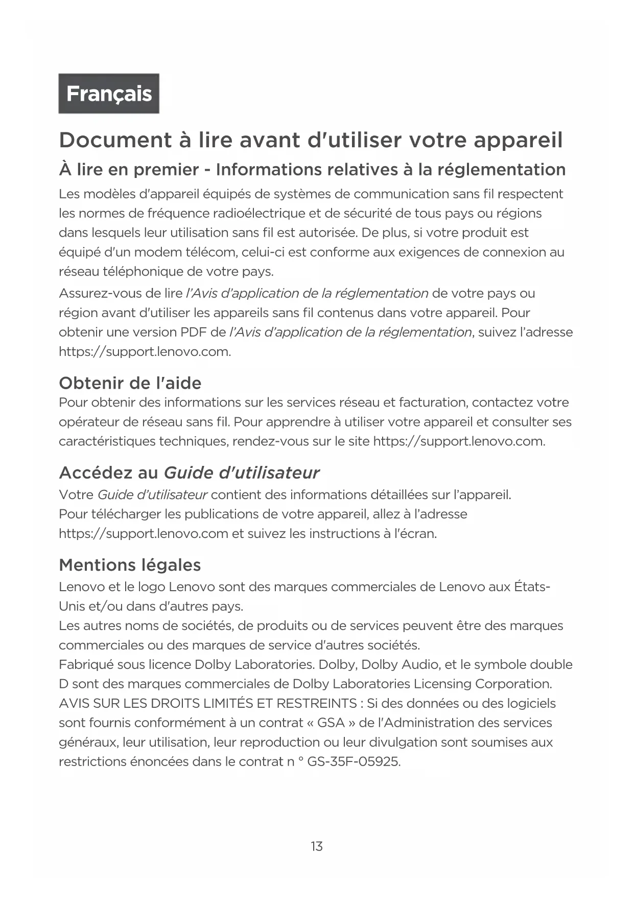 Français Document à lire avant d'utiliser votre appareil À lire en premier - Informations relatives à la réglementation Les modèles d'appareil équipés de systèmes de communication sans fil respectent les normes de fréquence radioélectrique et de sécurité de tous pays ou régions dans lesquels leur utilisation sans fil est autorisée. De plus, si votre produit est équipé d'un modem télécom, celui-ci est conforme aux exigences de connexion au réseau téléphonique de votre pays. Assurez-vous de lire l’Avis d’application de la réglementation de votre pays ou région avant d'utiliser les appareils sans fil contenus dans votre appareil. Pour obtenir une version PDF de l’Avis d’application de la réglementation, suivez l’adresse https://support.lenovo.com. Obtenir de l'aide Pour obtenir des informations sur les services réseau et facturation, contactez votre opérateur de réseau sans fil. Pour apprendre à utiliser votre appareil et consulter ses caractéristiques techniques, rendez-vous sur le site https://support.lenovo.com. Accédez au Guide d'utilisateur Votre Guide d’utilisateur contient des informations détaillées sur l’appareil. Pour télécharger les publications de votre appareil, allez à l’adresse https://support.lenovo.com et suivez les instructions à l'écran. Mentions légales Lenovo et le logo Lenovo sont des marques commerciales de Lenovo aux États- Unis et/ou dans d'autres pays. Les autres noms de sociétés, de produits ou de services peuvent être des marques commerciales ou des marques de service d'autres sociétés. Fabriqué sous licence Dolby Laboratories. Dolby, Dolby Audio, et le symbole double D sont des marques commerciales de Dolby Laboratories Licensing Corporation. AVIS SUR LES DROITS LIMITÉS ET RESTREINTS: Si des données ou des logiciels sont fournis conformément à un contrat «GSA» de l'Administration des services généraux, leur utilisation, leur reproduction ou leur divulgation sont soumises aux restrictions énoncées dans le contrat n° GS-35F-05925.14 Présentation de l'appareil Modèle Version Lenovo TB-7306F WLAN Lenovo TB-7306X WLAN + LTE