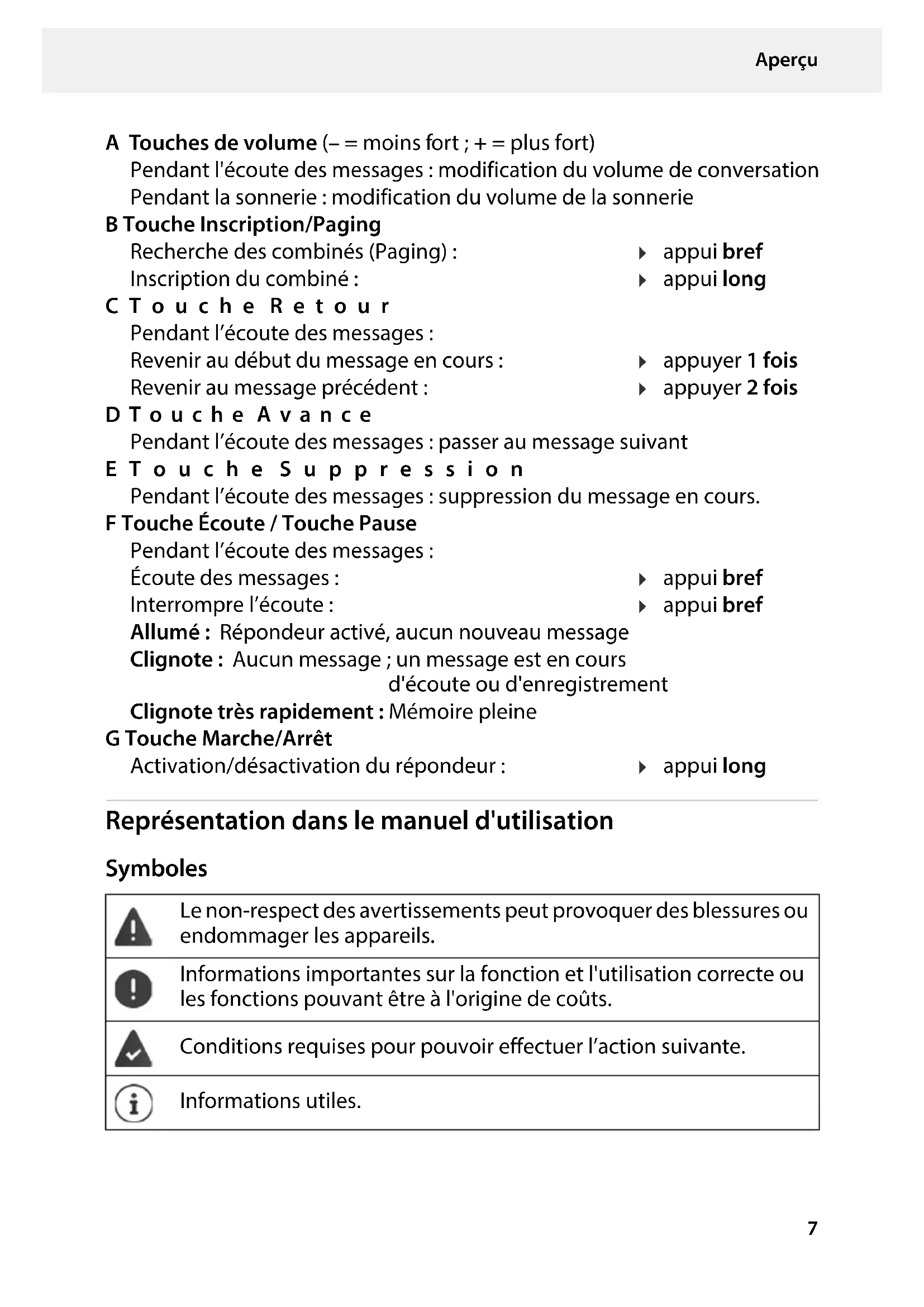 Représentation dans le manuel d'utilisation Symboles ATouches de volume (– = moins fort ; + = plus fort) Pendant l'écoute des messages : modification du volume de conversation Pendant la sonnerie : modification du volume de la sonnerie B Touche Inscription/Paging Recherche des combinés (Paging) : appui bref Inscription du combiné : appui long CTouche Retour Pendant l’écoute des messages : Revenir au début du message en cours : appuyer 1 fois Revenir au message précédent : appuyer 2 fois DTouche Avance Pendant l’écoute des messages : passer au message suivant ETouche Suppression Pendant l’écoute des messages : suppression du message en cours. F Touche Écoute / Touche Pause Pendant l’écoute des messages : Écoute des messages : appui bref Interrompre l’écoute : appui bref Allumé : Répondeur activé, aucun nouveau message Clignote : Aucun message ; un message est en cours d'écoute ou d'enregistrement Clignote très rapidement : Mémoire pleine G Touche Marche/Arrêt Activation/désactivation du répondeur : appui long Le non-respect des avertissements peut provoquer des blessures ou endommager les appareils. Informations importantes sur la fonction et l'utilisation correcte ou les fonctions pouvant être à l'origine de coûts. Conditions requises pour pouvoir effectuer l’action suivante. Informations utiles.Template Module, Version 2.1, 11.08.2020 / Template Basiseinstellungen: Version 3.1 - 07.07.2020 Aperçu Gigaset E200(A)/E290(A) / LUG-Kombi FR (Darty, Carrefour) fr / A31008-M2901-N101-2-7719 /